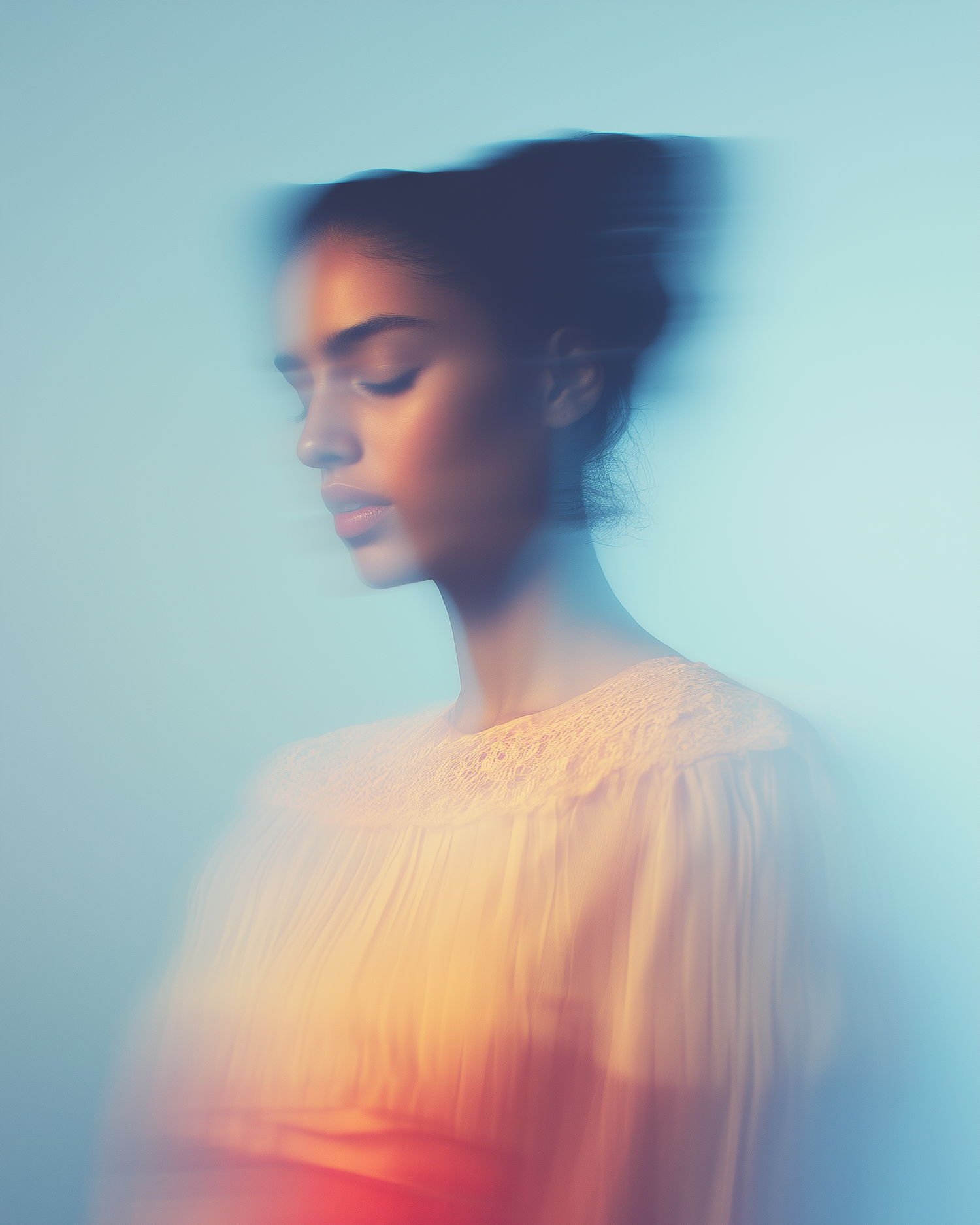 Dreamy portrait of a serene woman with closed eyes, soft focus, and warm lighting against a gradient blue-orange background.