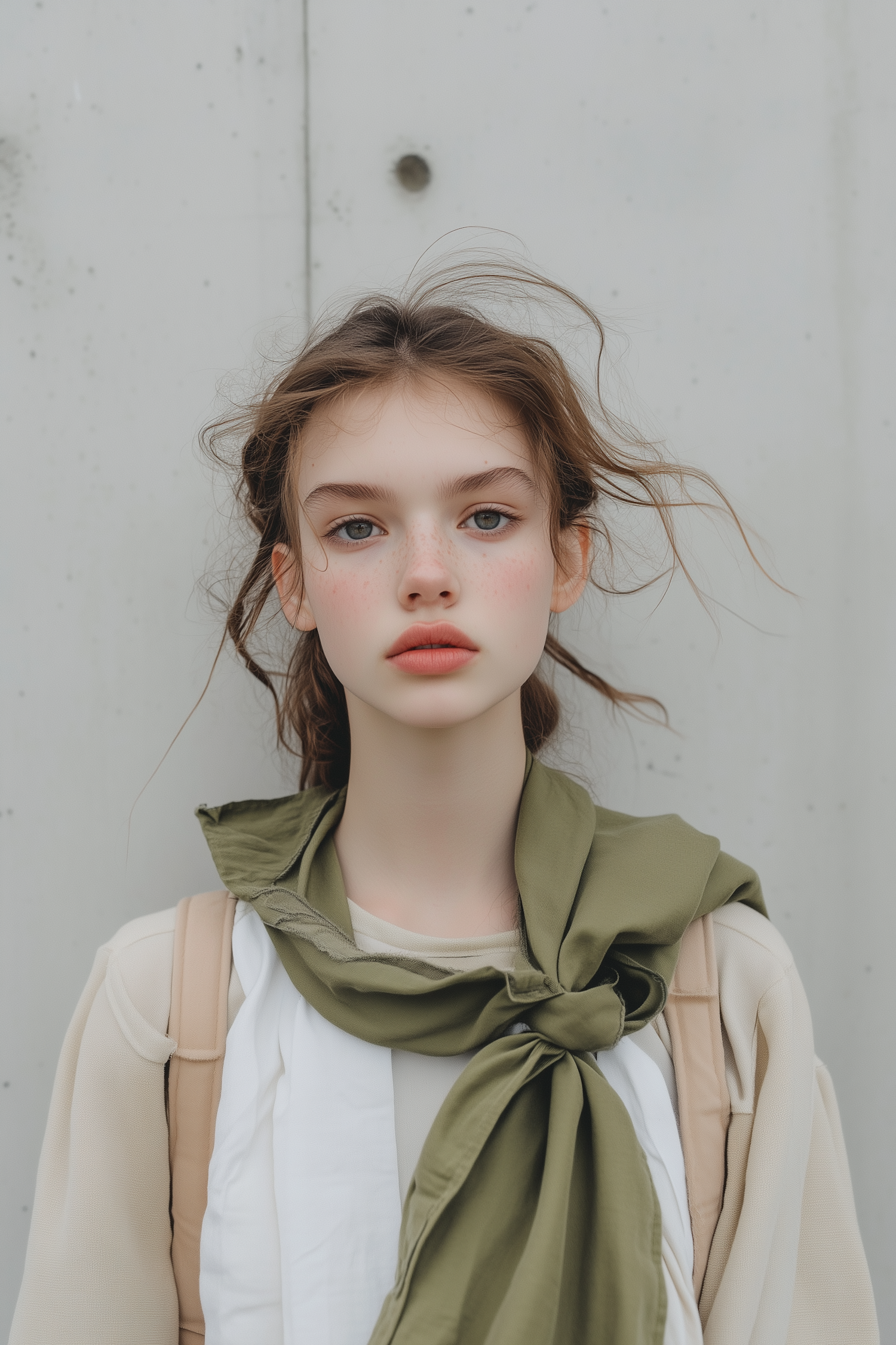 Young woman with light brown hair and blue eyes, wearing a green scarf, stands against a plain background. Minimalist and serene portrait.