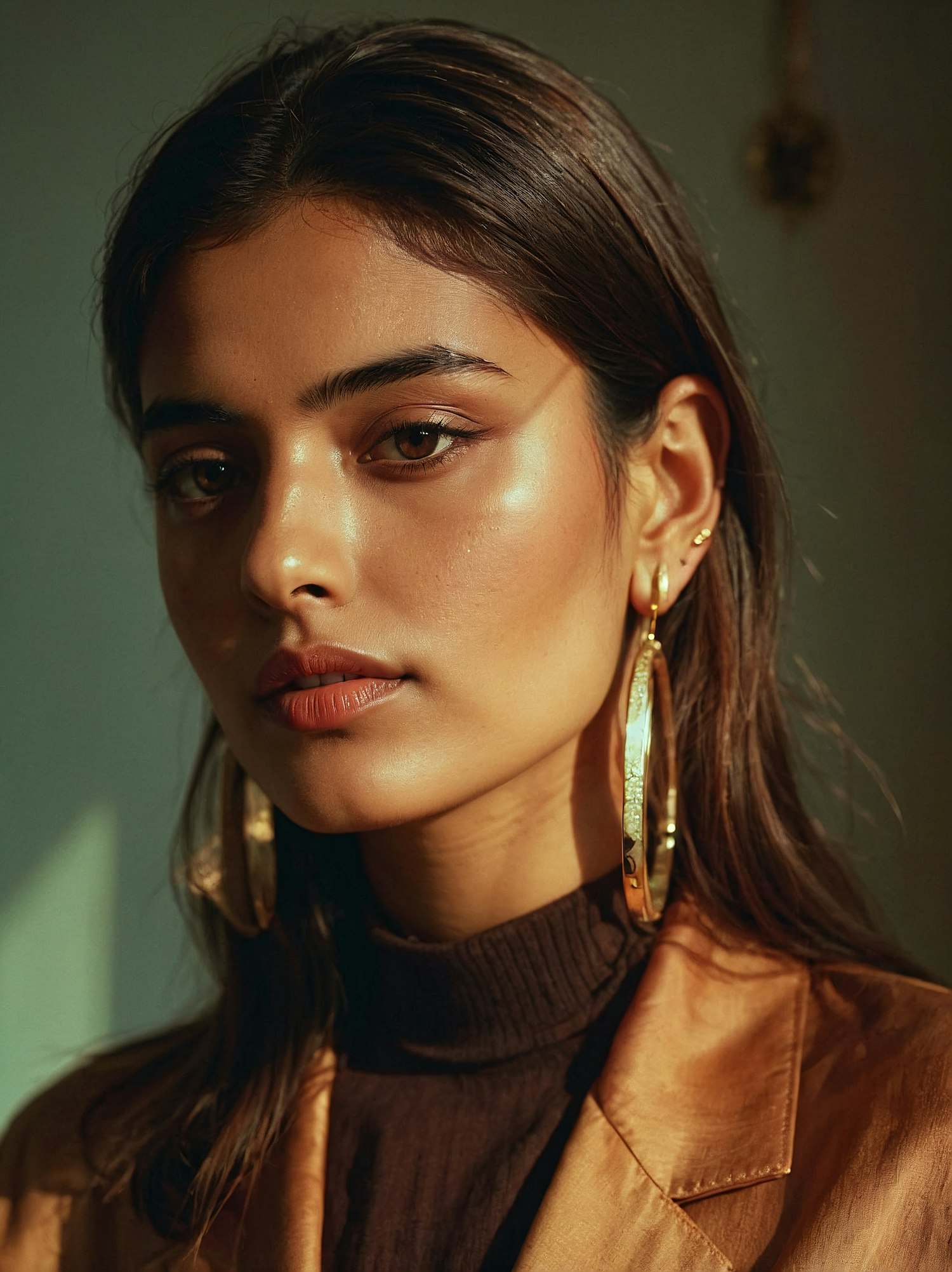 Portrait of a young woman with gold hoop earrings, brown hair, and warm lighting, wearing a brown turtleneck and golden-brown jacket.