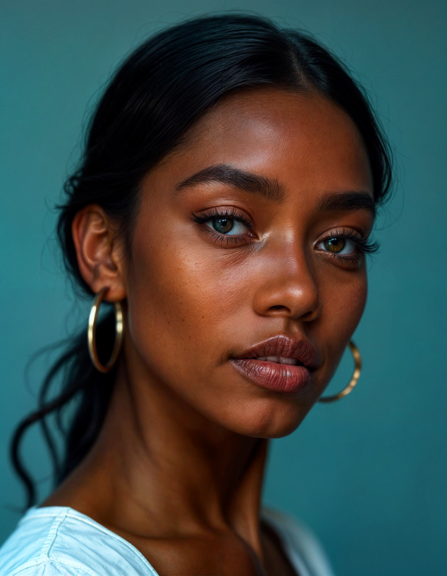 Close-up of a woman with brown skin, green eyes, gold hoop earrings, and a teal background, exuding natural beauty and confidence.