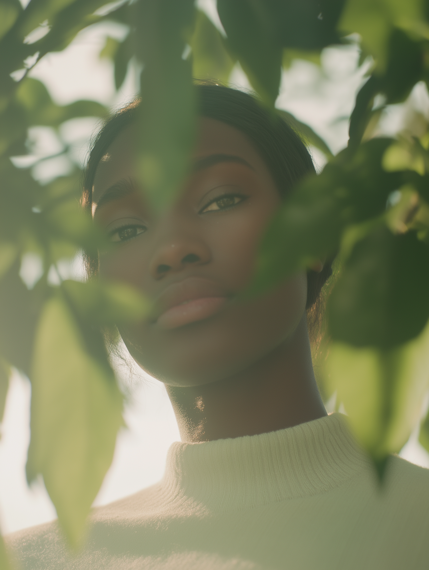 A serene portrait of a woman framed by soft-focus green leaves, with natural lighting and a calm, contemplative expression.