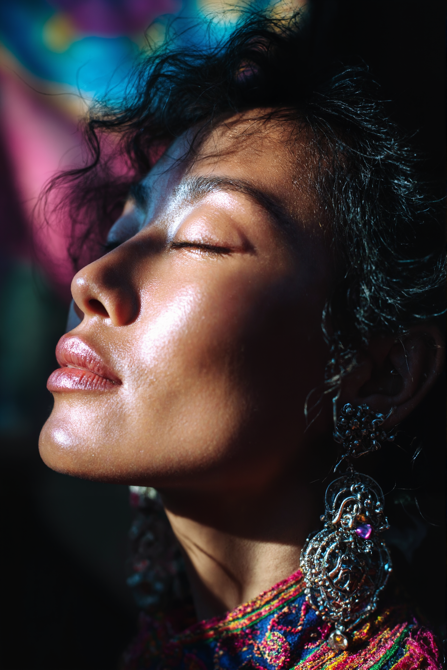 Close-up of a serene woman with glowing skin, intricate silver earrings, and vibrant colors in the background. A stunning portrait.
