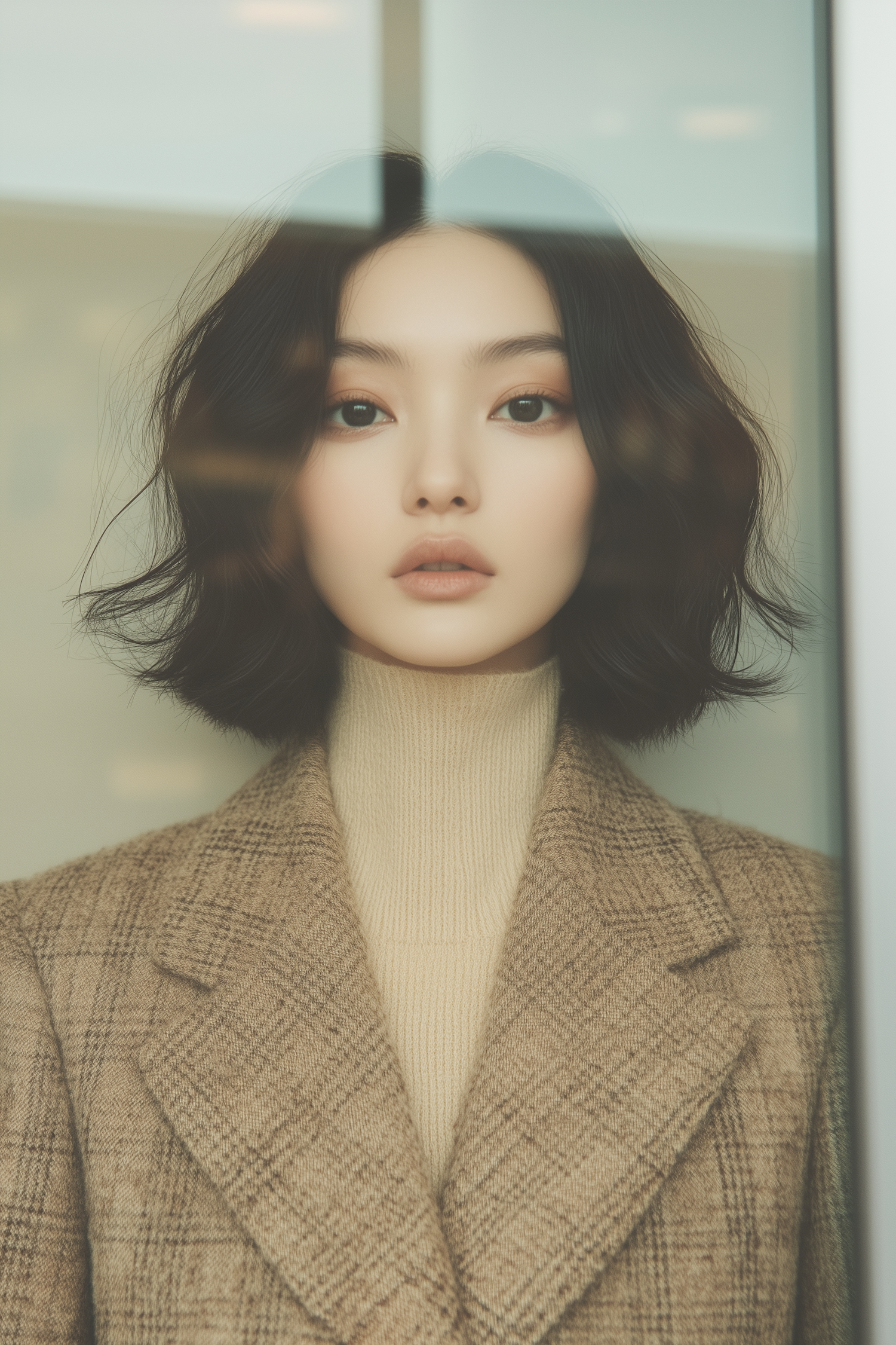 Elegant portrait of a young woman in a plaid blazer and turtleneck, gazing through a glass window with a serene expression.