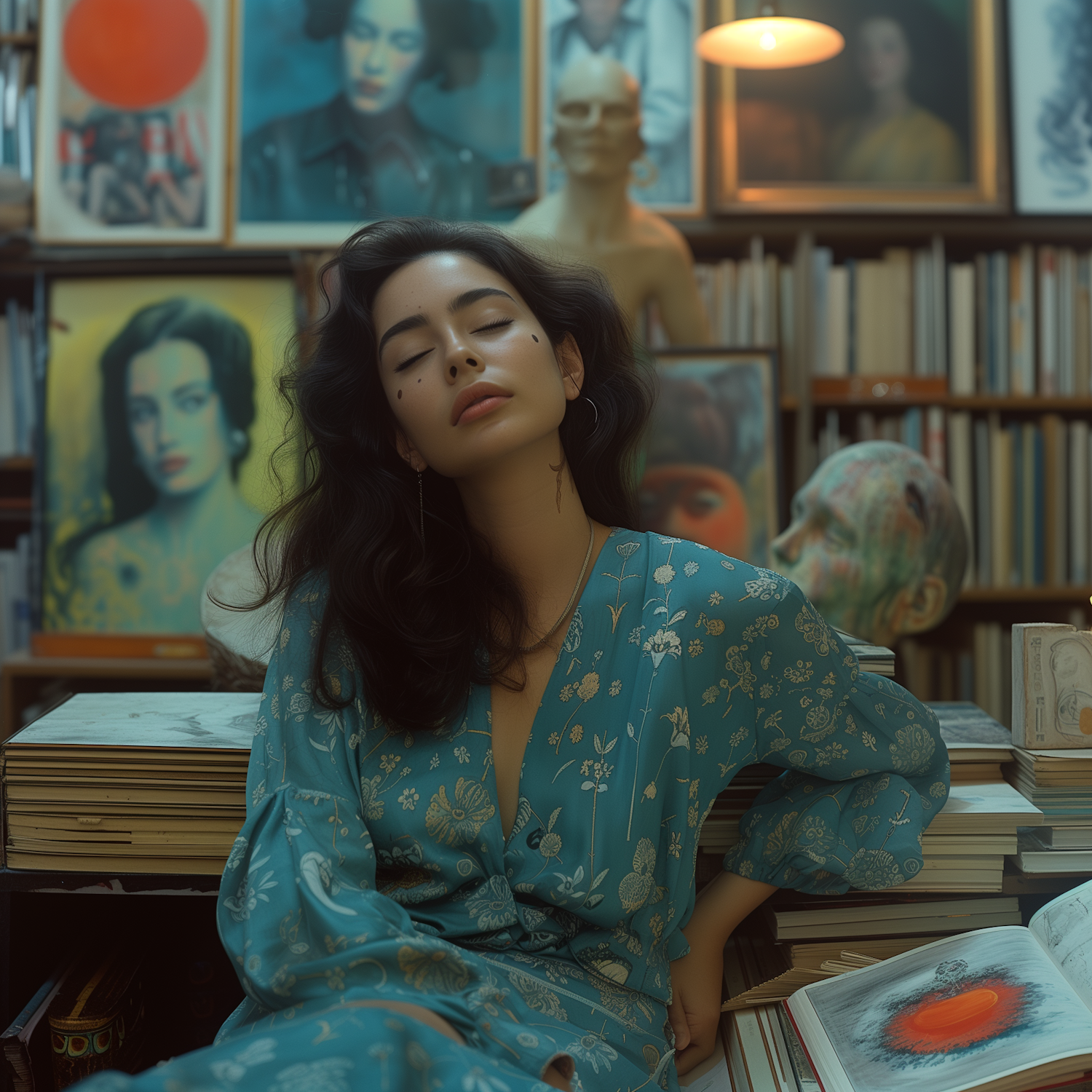 Woman in teal floral dress sits serenely in an art-filled library, surrounded by books, portraits, and sculptures under warm lighting.