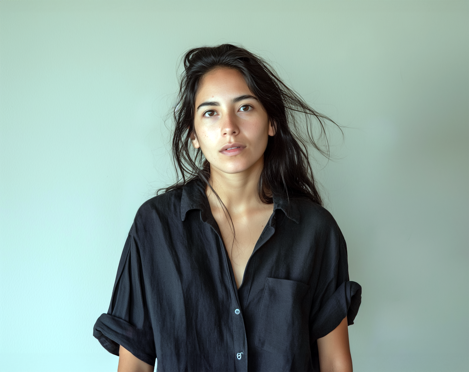 Young woman with long dark hair in a loose dark shirt, standing against a plain background, looking contemplative.