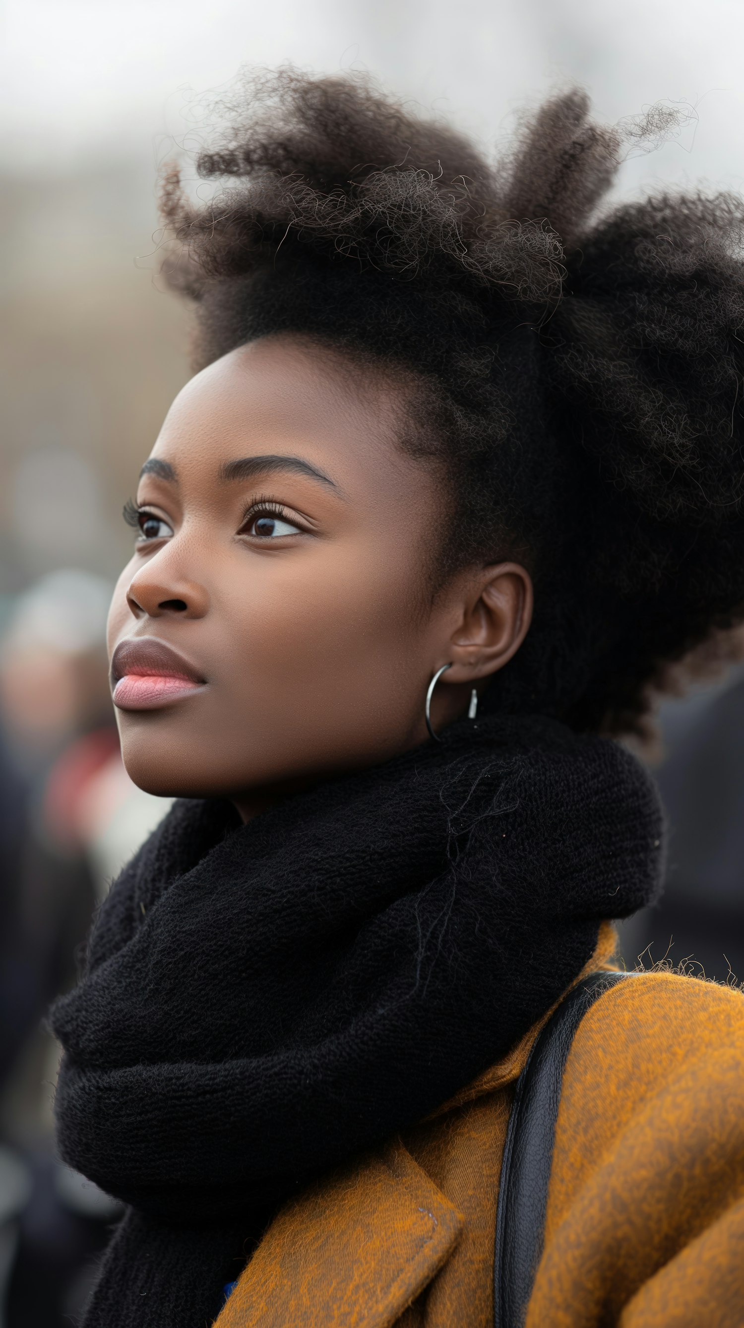 Portrait of a young Black woman with natural hair, wearing a black scarf and mustard coat, gazing thoughtfully into the distance.
