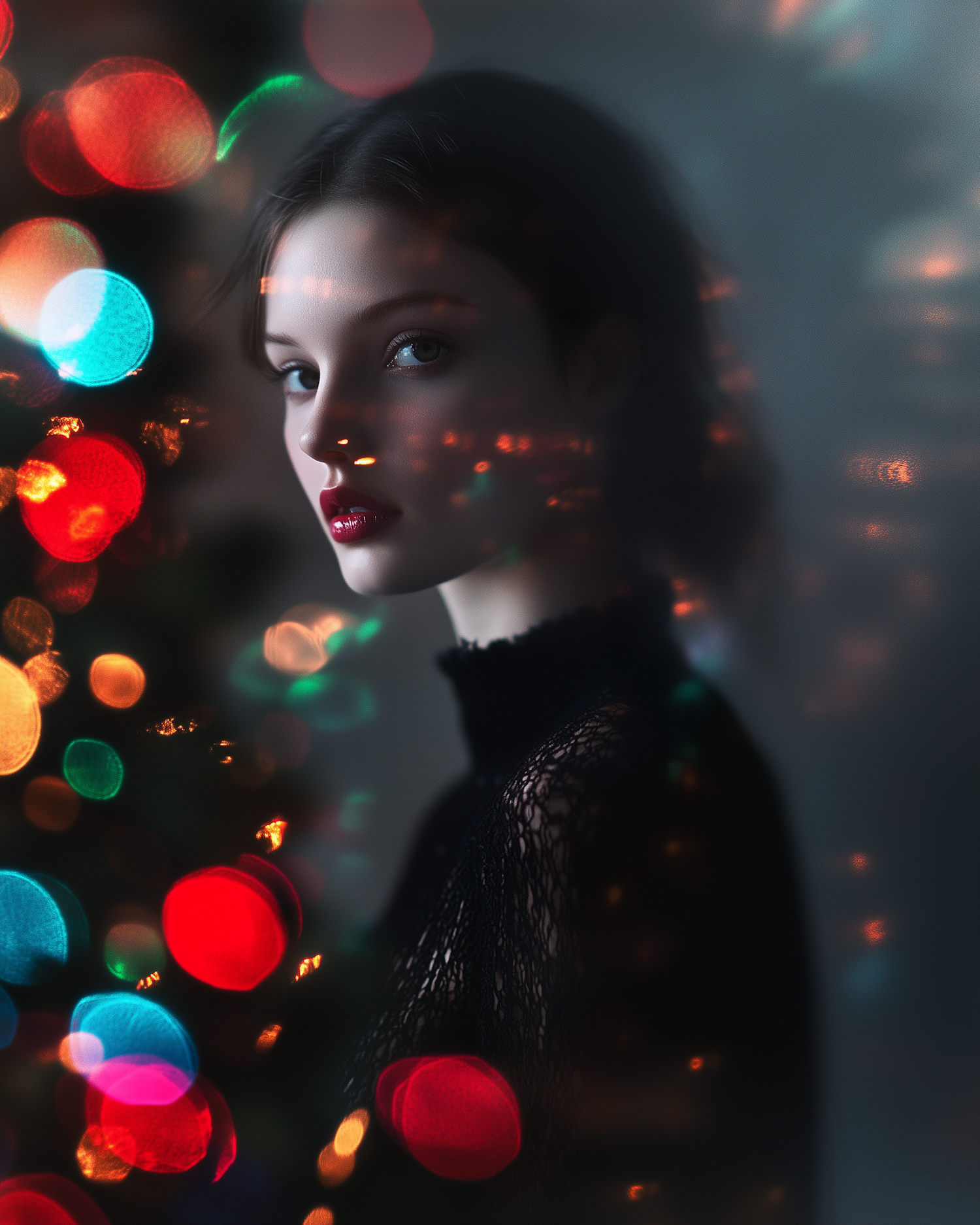 A serene woman in a black lace top with colorful bokeh lights, creating a dreamy and festive atmosphere.