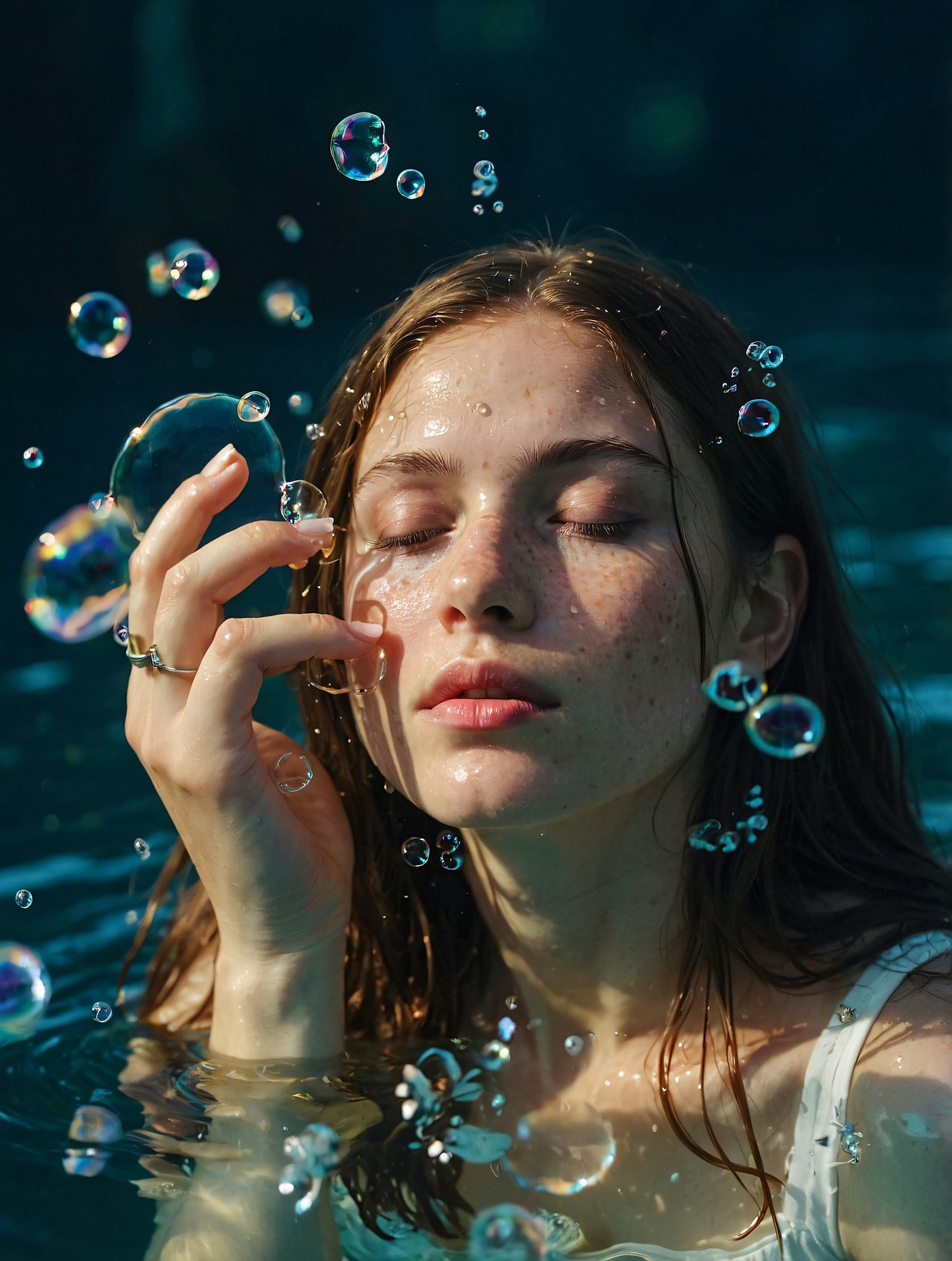 A serene woman with wet auburn hair in water, surrounded by colorful bubbles, exuding a dreamy and tranquil vibe.