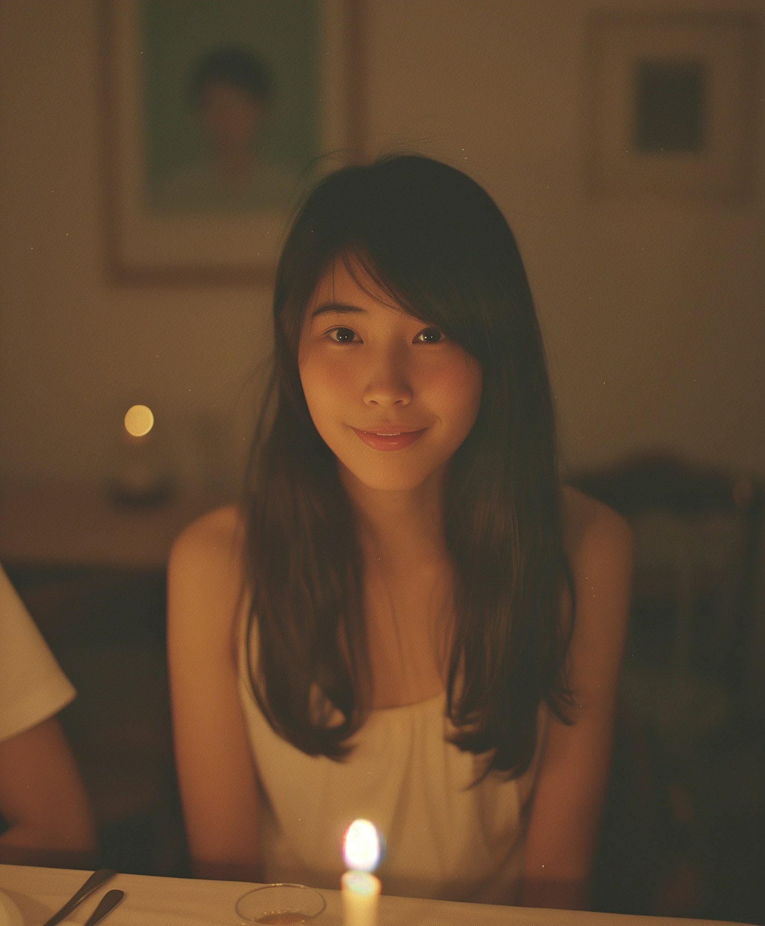 Young Asian woman with long hair, softly lit by candlelight, creating a warm and intimate atmosphere.