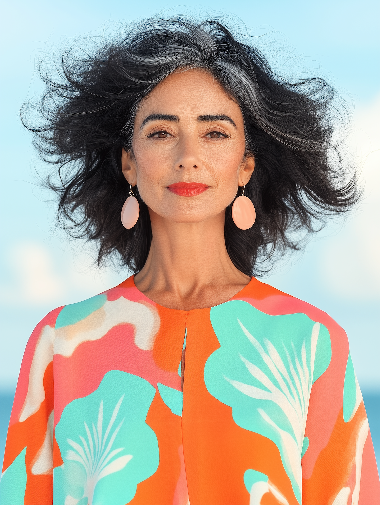 Elegant woman with flowing gray hair and vibrant blouse against a clear sky, exuding confidence and grace.