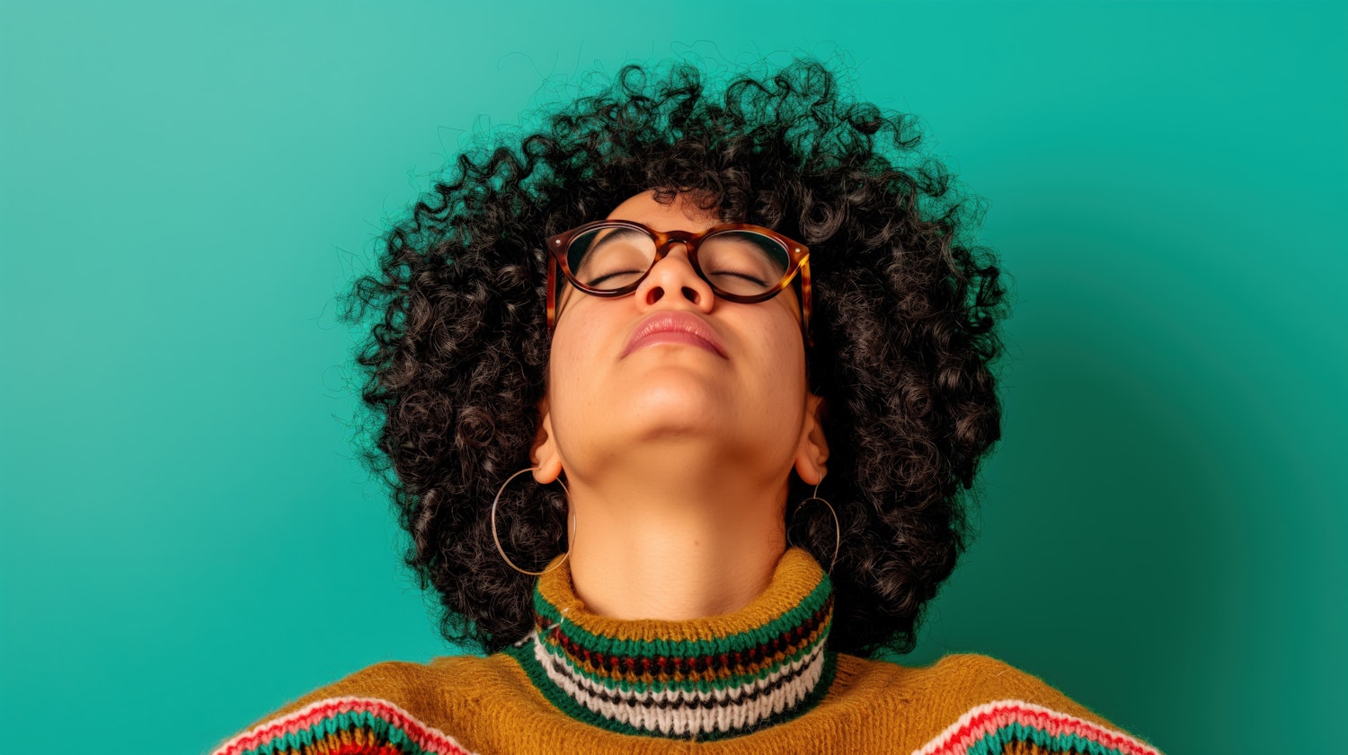 Woman with curly hair and glasses in a colorful sweater against a teal background, exuding a serene and relaxed vibe.