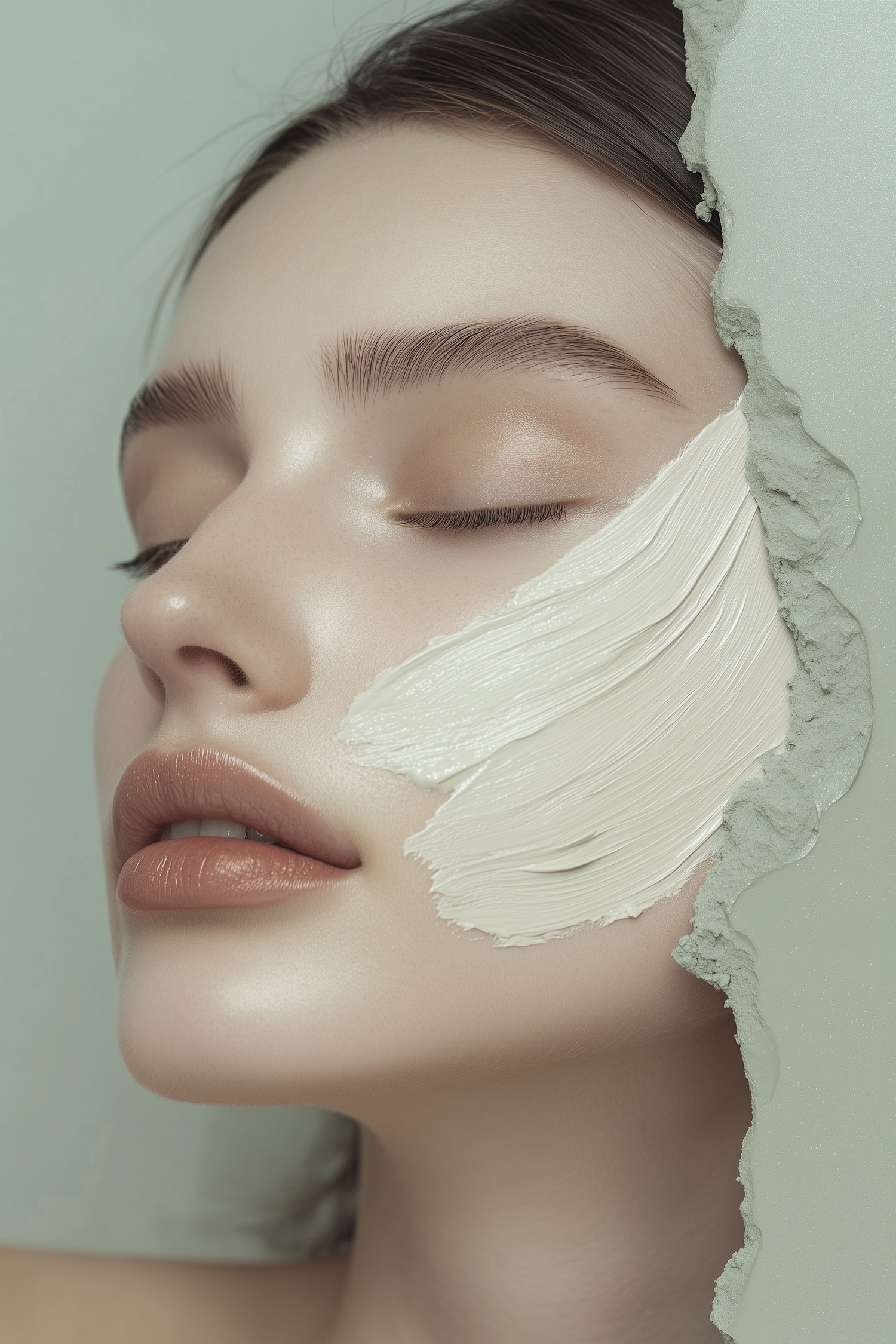 Close-up of a woman's face with creamy texture on her cheek, closed eyes, and serene expression against a muted green background.