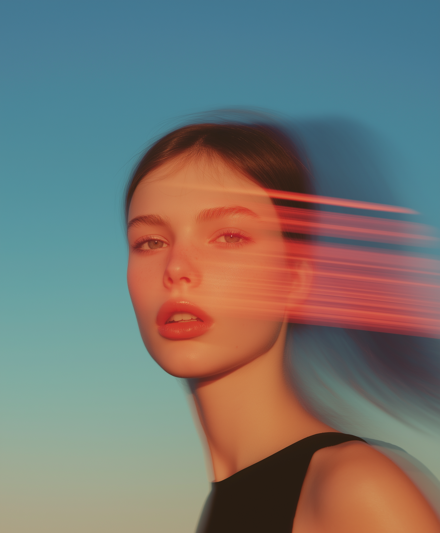 Surreal portrait of a young woman with a pink light streak, set against a blue and orange gradient background.