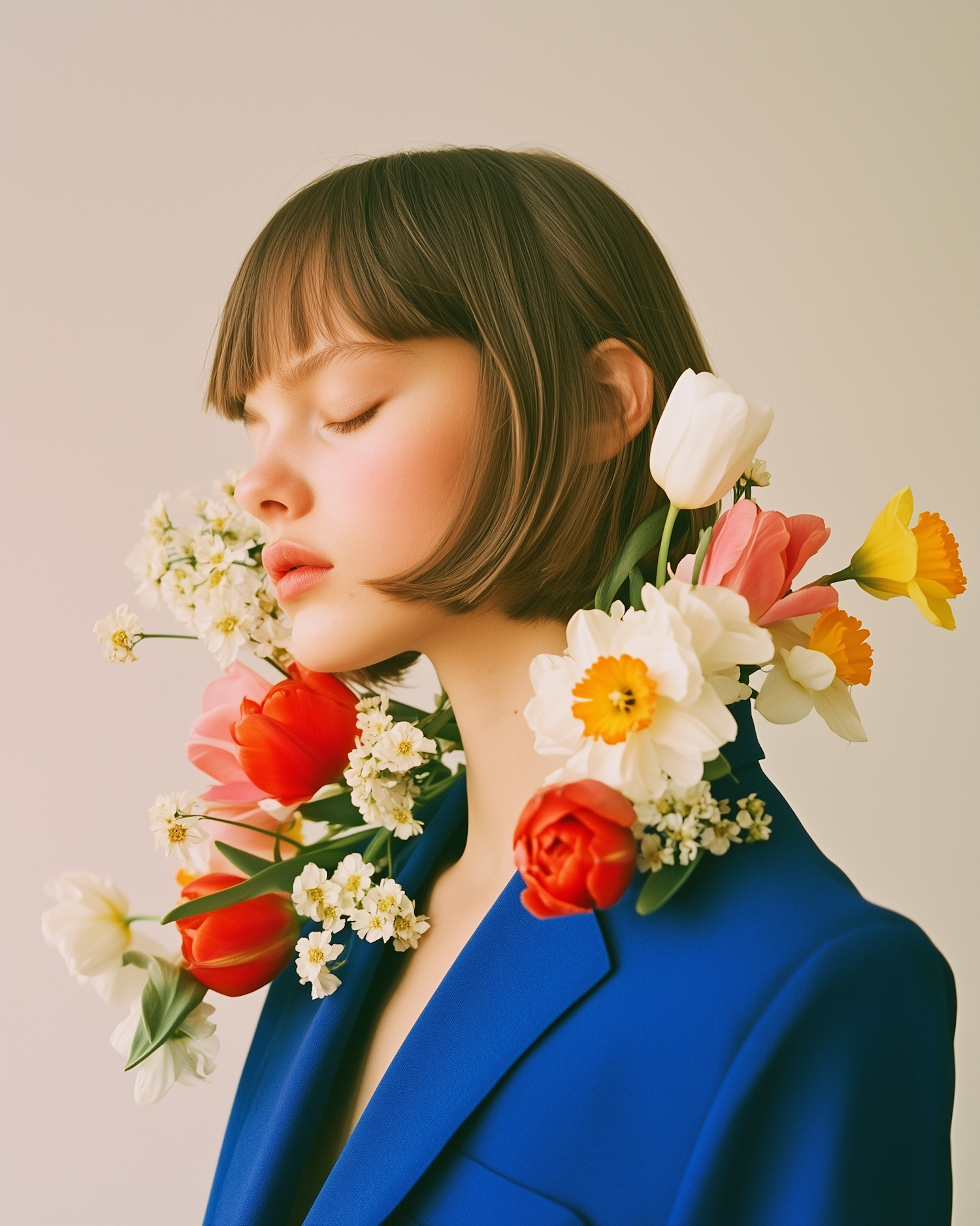 Serene woman with short brown hair in a blue blazer, adorned with vibrant flowers, creating a striking contrast against a neutral background.