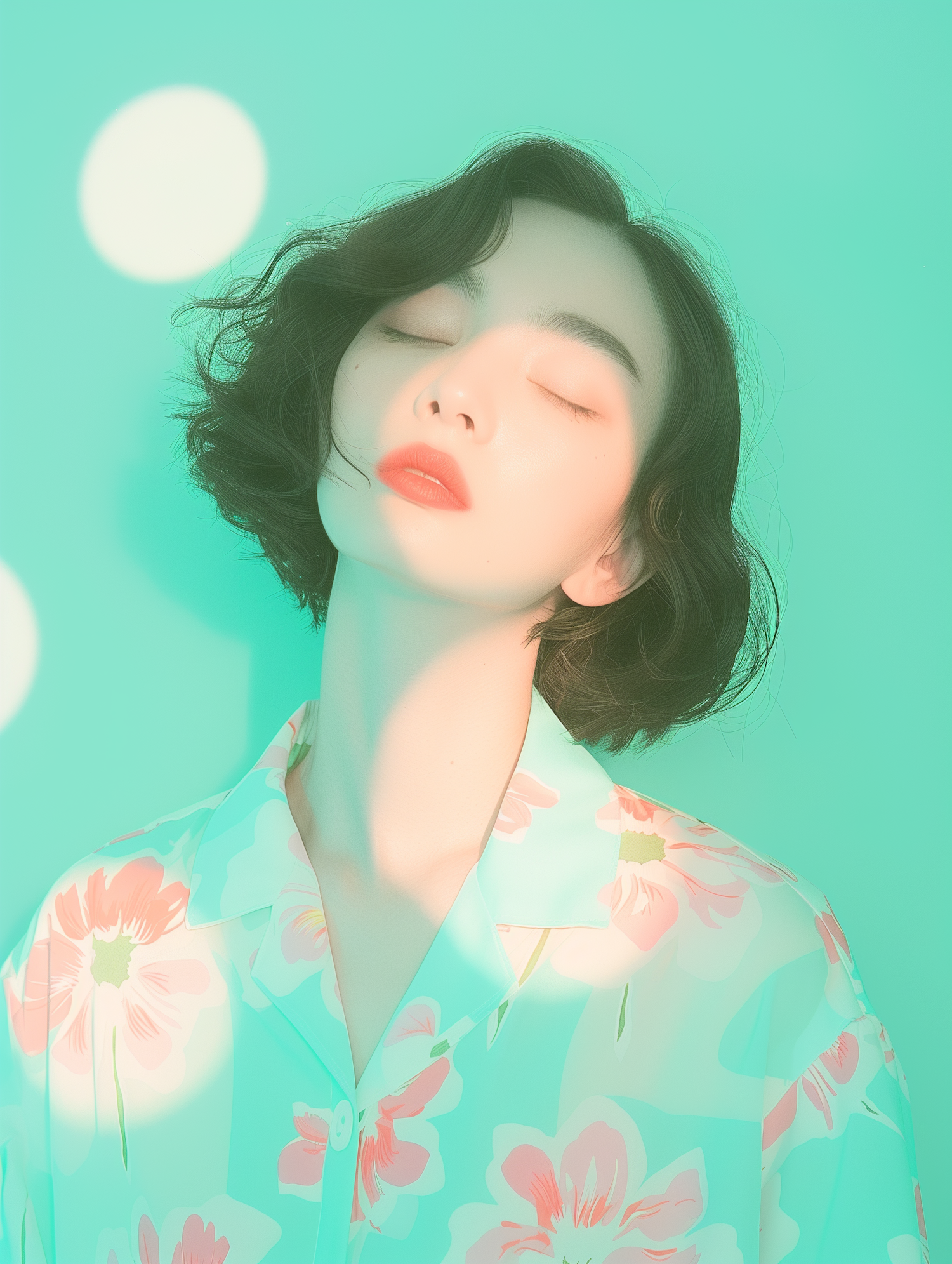 Serene portrait of a young woman with closed eyes, wearing a floral shirt against a mint green background.