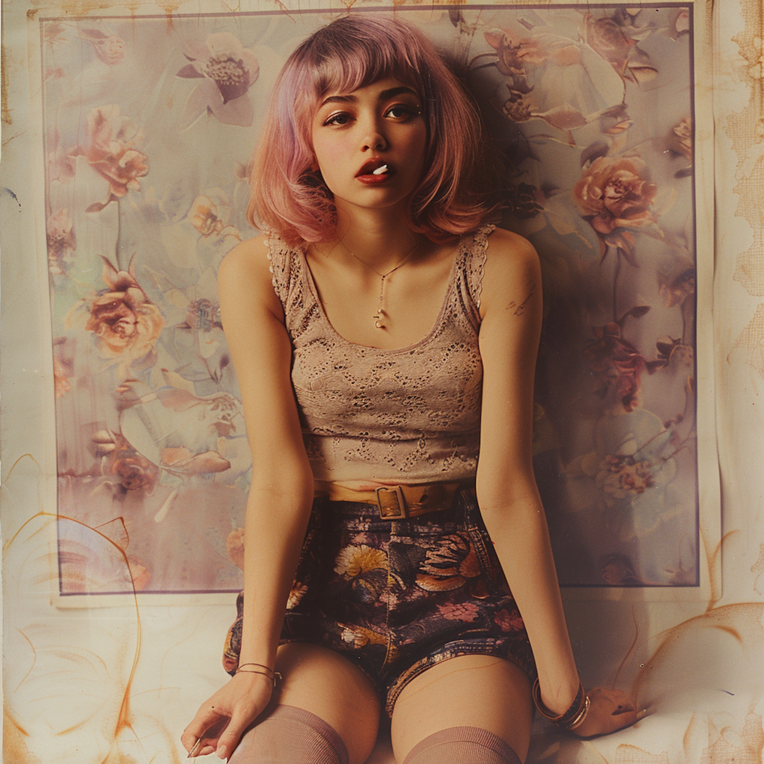 Young woman with pink hair and floral outfit sits against a floral background, exuding a relaxed and stylish vibe.