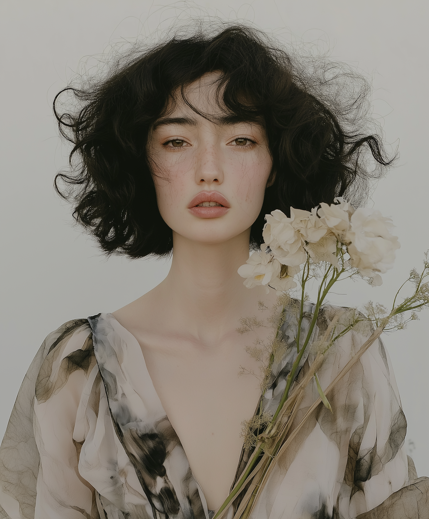 Portrait of a young woman with curly hair holding dried flowers, wearing a sheer dress with abstract patterns.