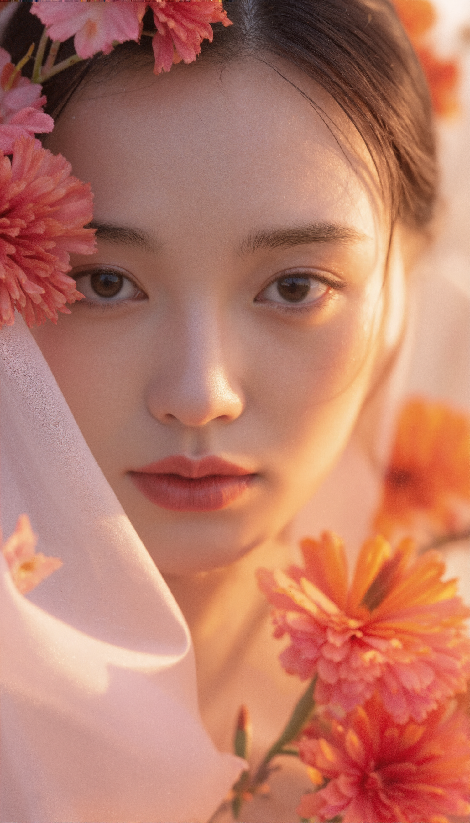 Close-up of an Asian woman surrounded by pink and orange flowers, with warm golden lighting and a serene expression.