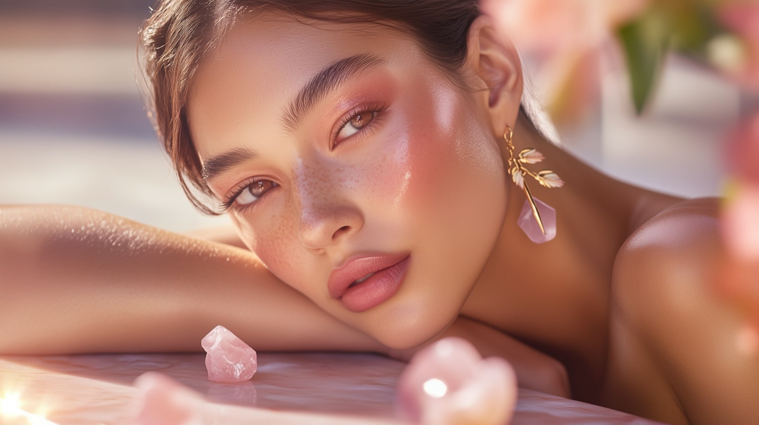 Serene woman with pink makeup and gold leaf earrings, resting on her arm in a dreamy, softly lit setting.