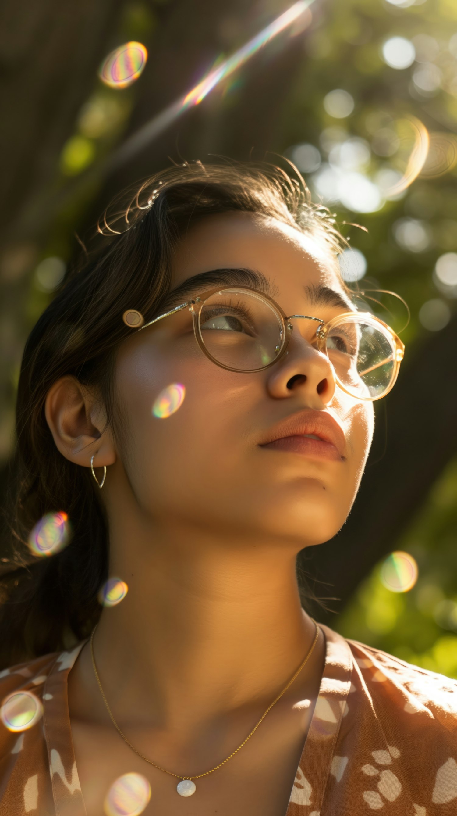 Young woman with glasses in sunlight, surrounded by bokeh and nature. Thoughtful expression, wearing a brown top and gold necklace.