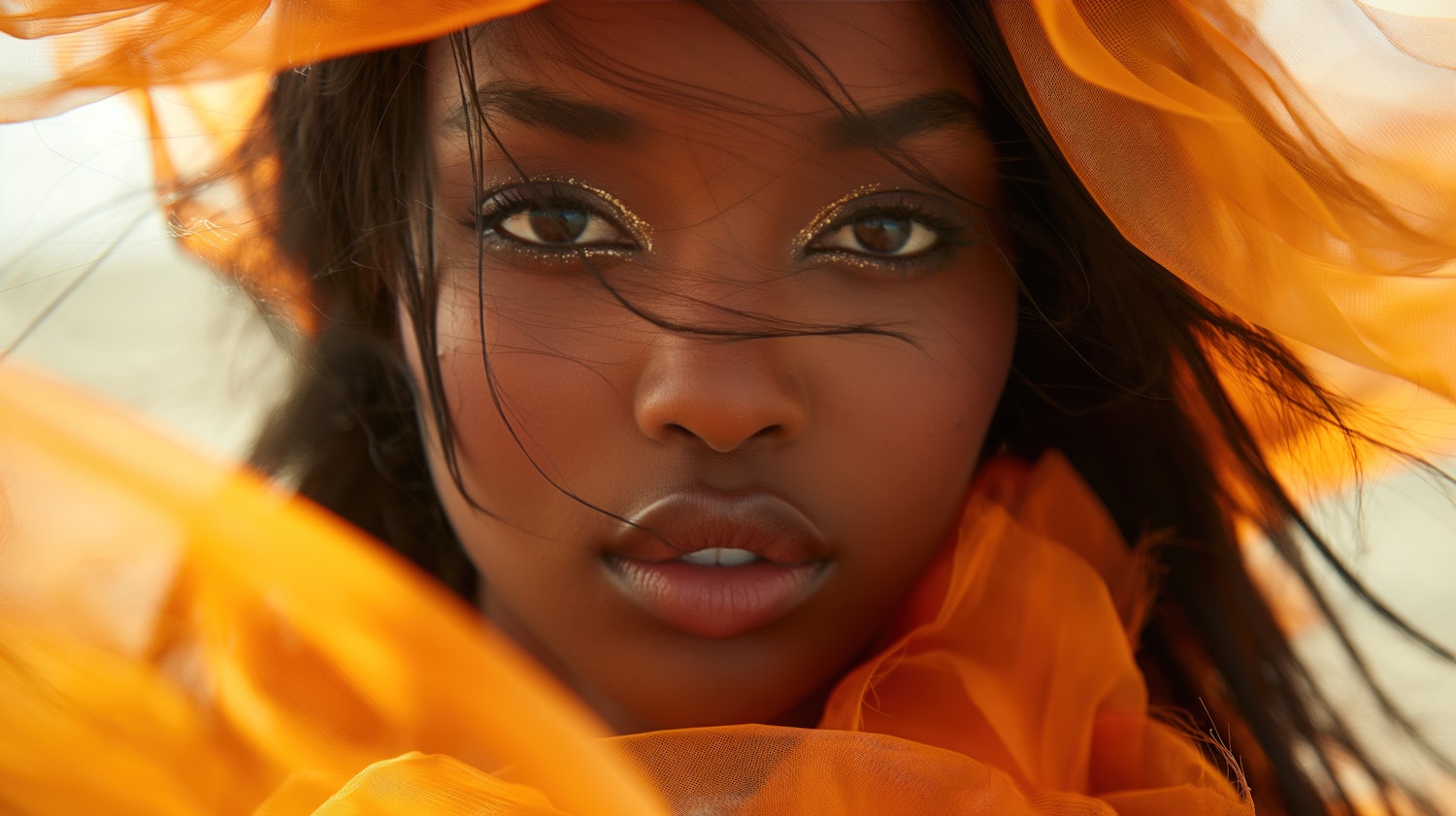 Close-up portrait of a woman with dark skin, gold eyeshadow, and orange fabric, creating a warm and ethereal visual effect.