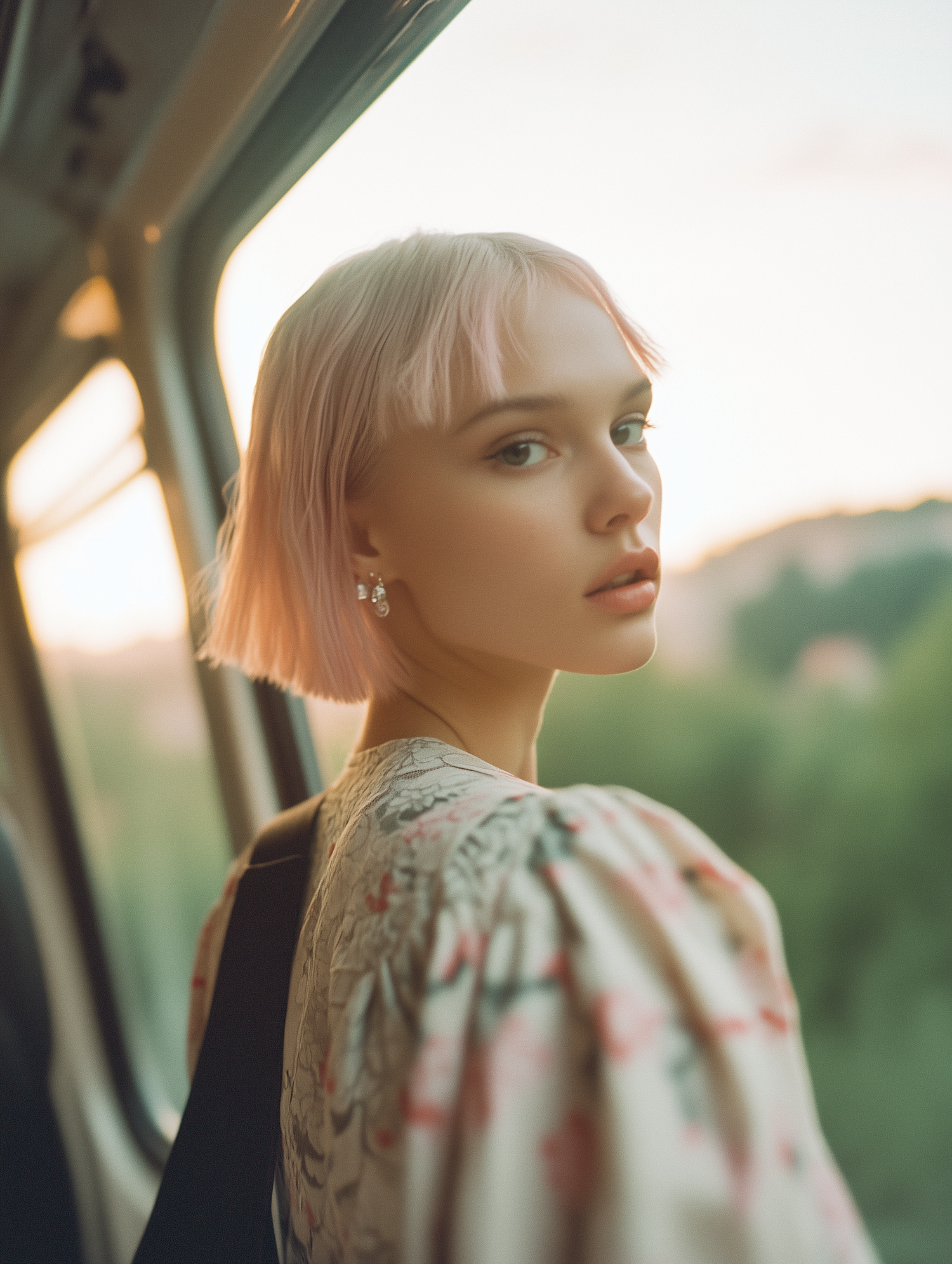 Young woman with pastel pink hair and floral blouse gazes softly, set against a blurred, warm-lit background.