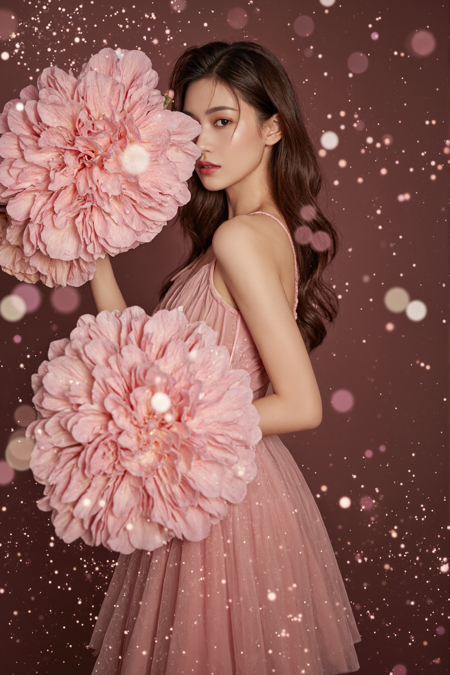 Elegant woman in pink dress holding large flowers, surrounded by sparkling bokeh lights. Dreamy and magical atmosphere.