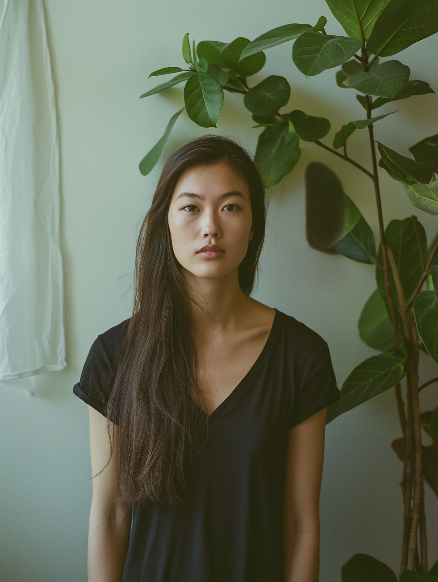 Asian woman with long hair in black T-shirt stands by a large green plant against a light green background.