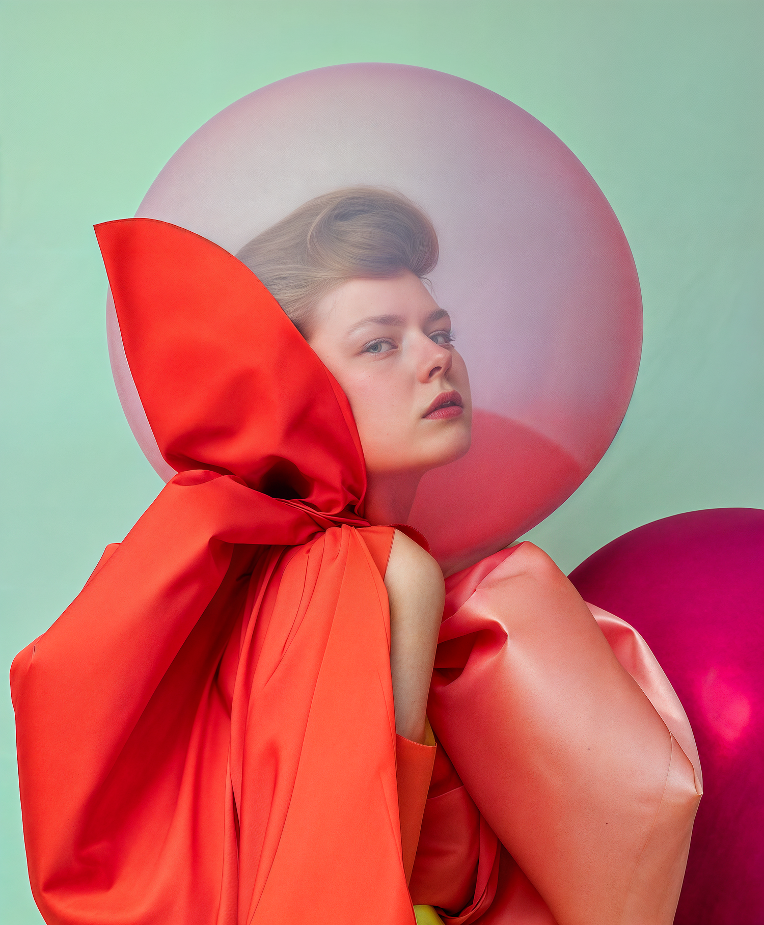 Avant-garde fashion portrait with bold colors and sculptural design, featuring a woman in a red outfit and pink sphere against a mint background.