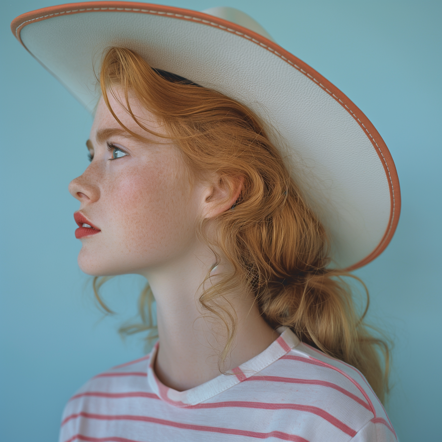 Profile of a young woman with red hair in a cowboy hat against a blue background, wearing a striped shirt.