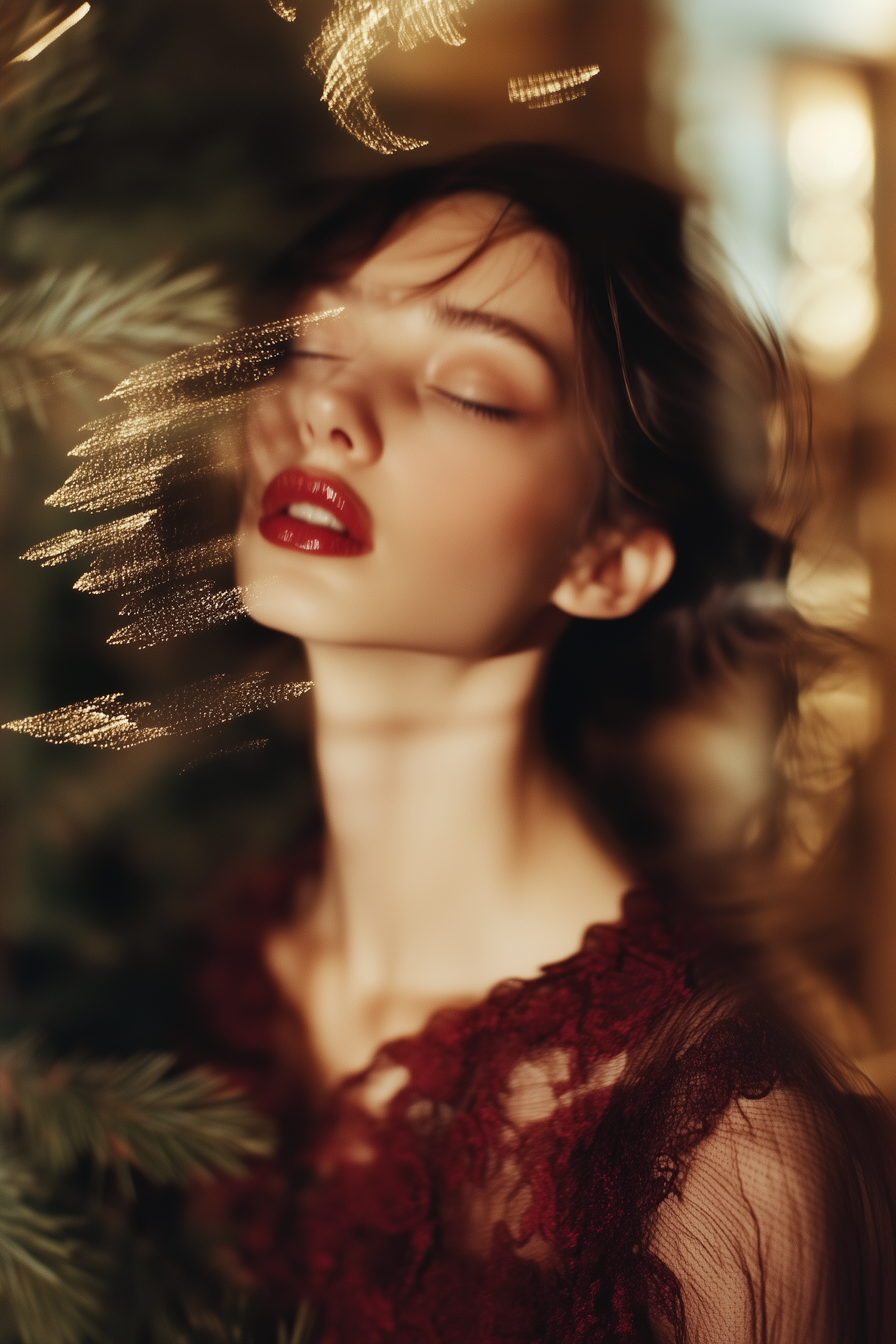 Ethereal portrait of a woman in red lace with closed eyes, surrounded by golden bokeh lights, creating a dreamy atmosphere.