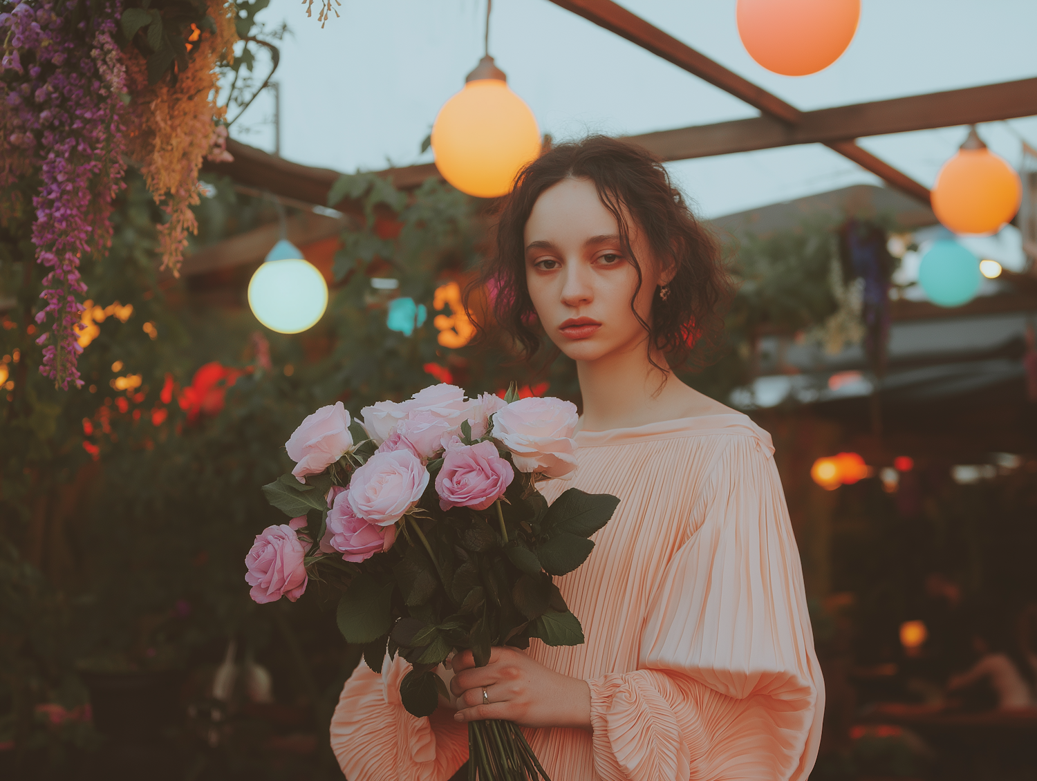 A young woman in a flowing dress holds pink roses in a garden with colorful hanging lights, creating a serene and dreamy atmosphere.