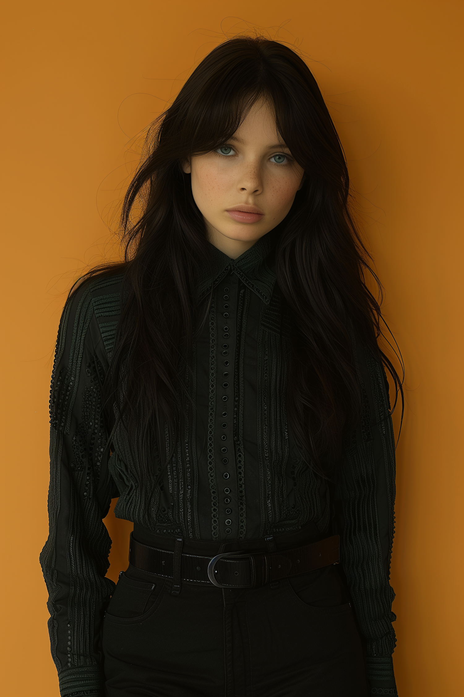 Young woman with dark hair and blue eyes in a green blouse against an orange background, creating a striking contrast.