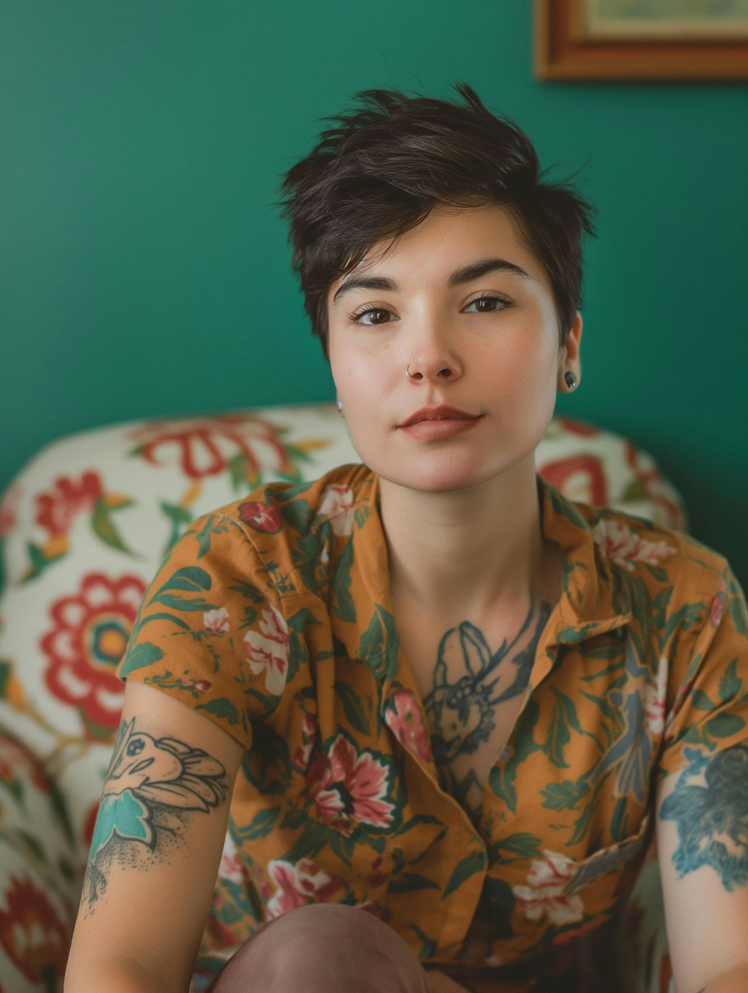 Young woman with short hair and tattoos, wearing a floral shirt against a green background, exuding a calm and artistic vibe.