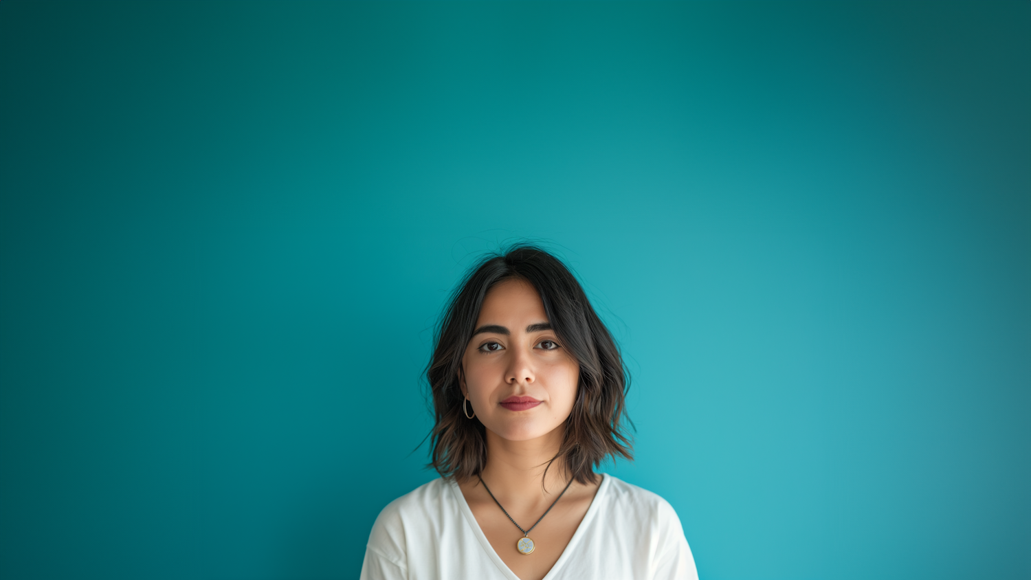 Young woman with dark hair and white shirt against a teal background, wearing a necklace and hoop earrings, with a calm expression.