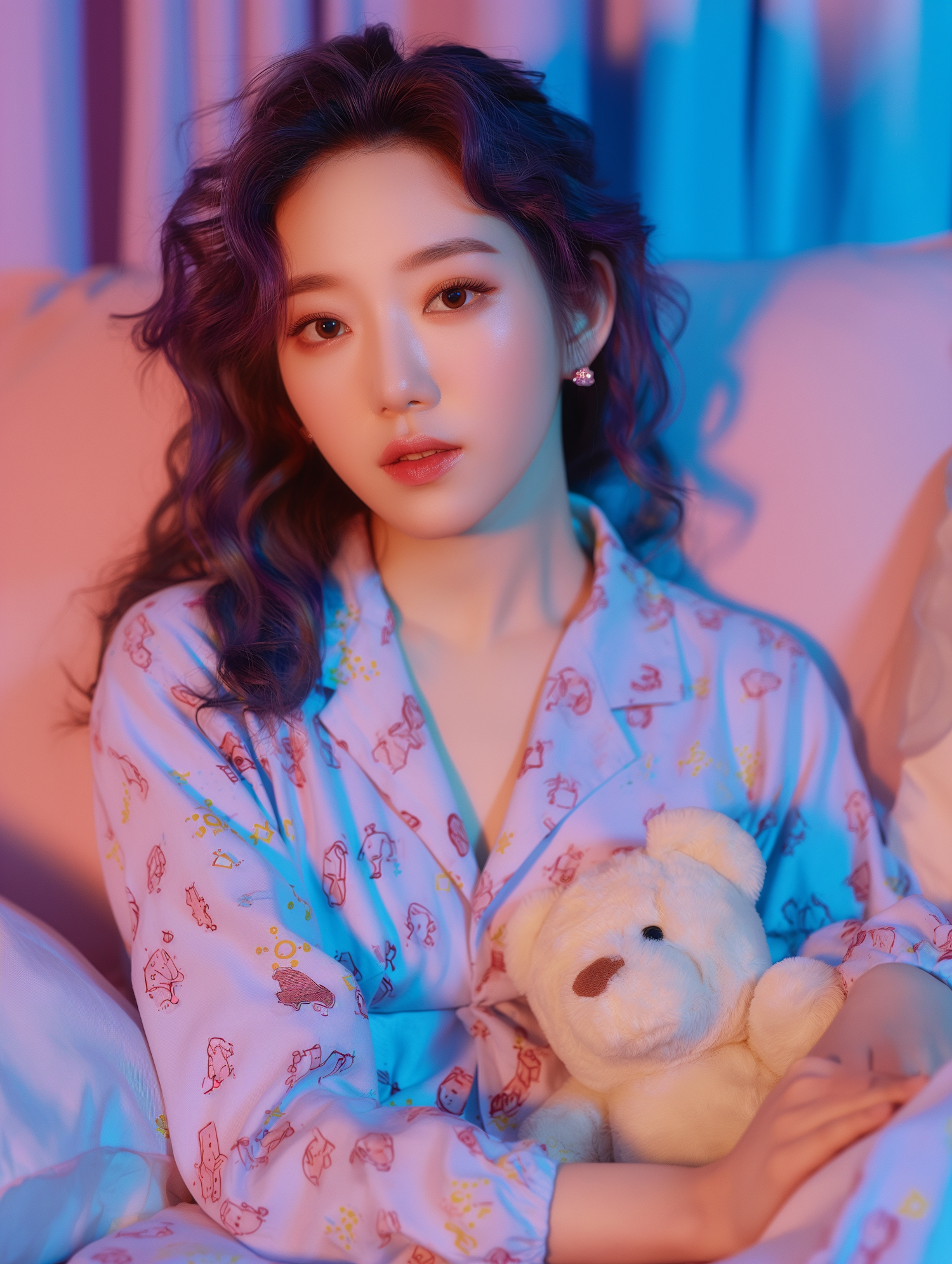 Asian woman with purple hair in pastel pajamas holding a teddy bear, set in dreamy pink and blue lighting.