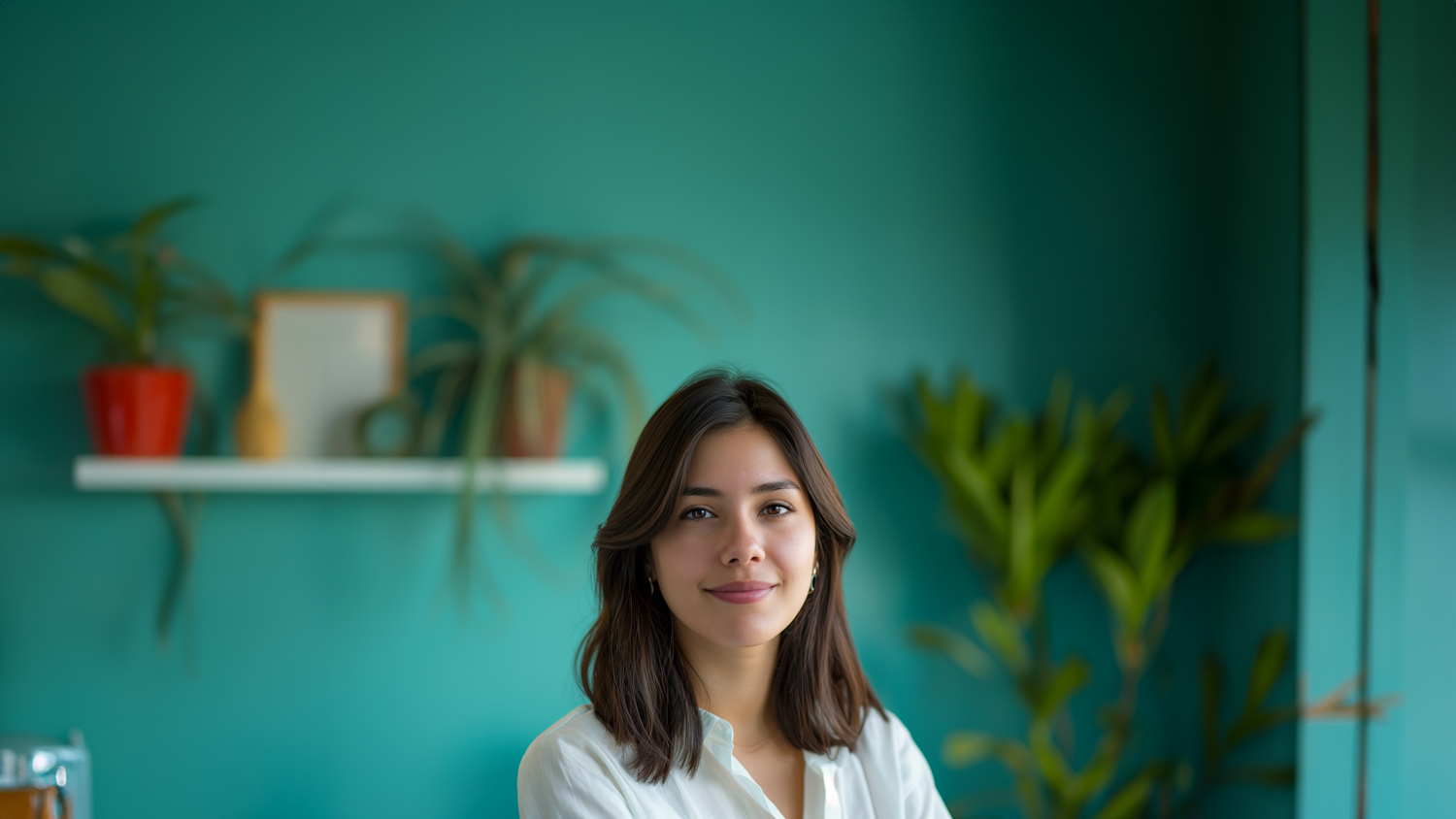 Young woman with dark hair and white blouse against a teal wall, surrounded by plants and a shelf with decor. Calm and inviting ambiance.