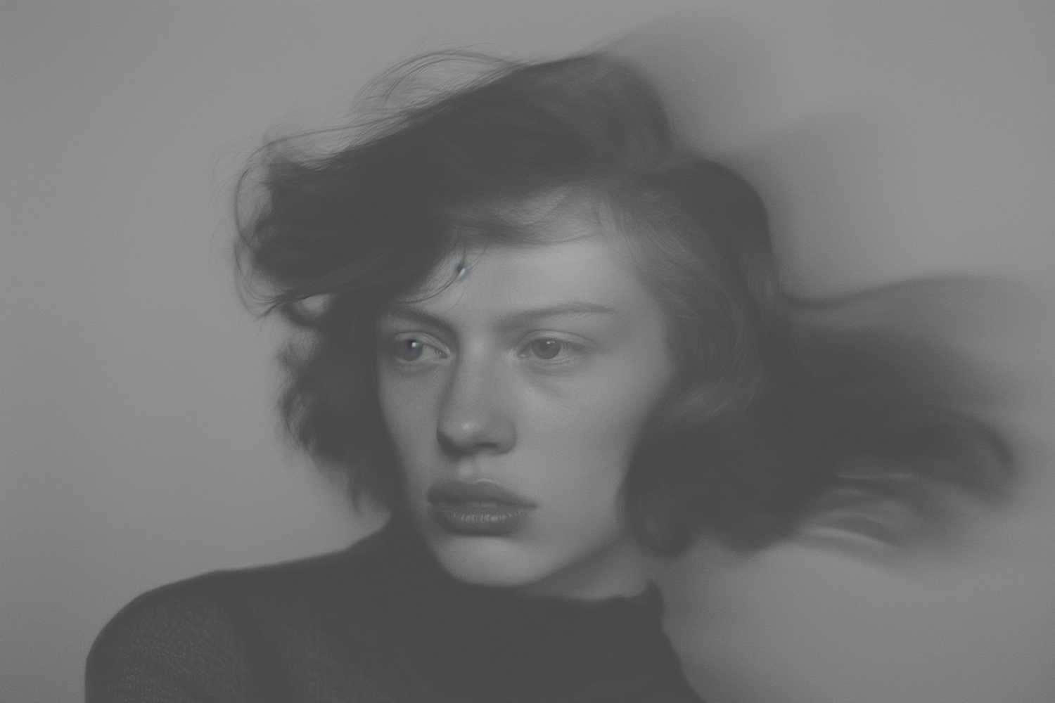 Monochromatic portrait with dynamic hair motion, light skin, and soft lighting, creating a serene and artistic atmosphere.