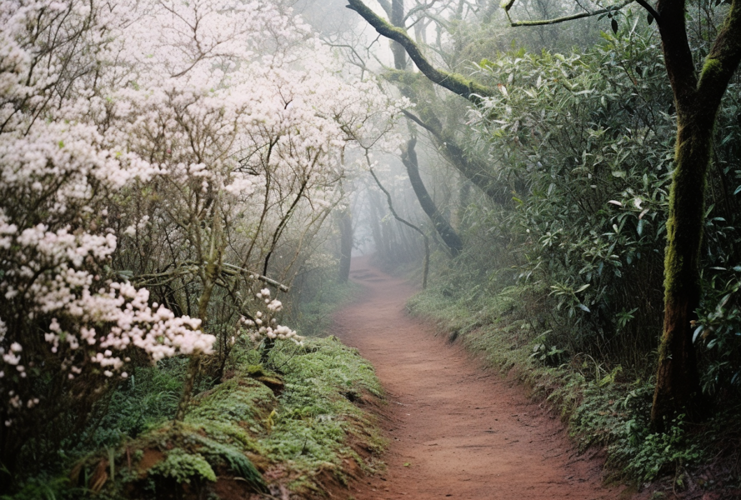 Misty Forest Trail with Blossoming Canopy