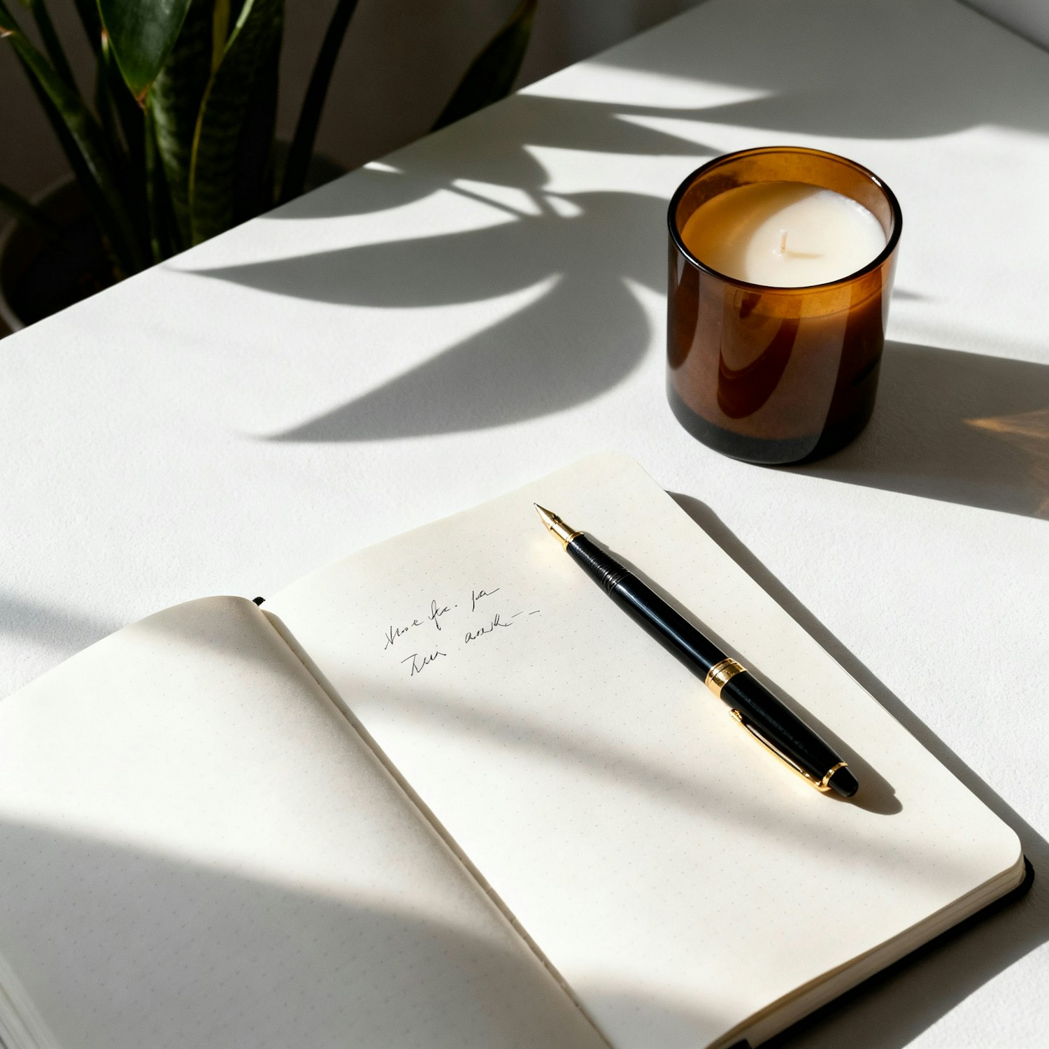 A cozy workspace with a notebook, fountain pen, and candle, bathed in natural light with plant shadows creating a serene vibe.