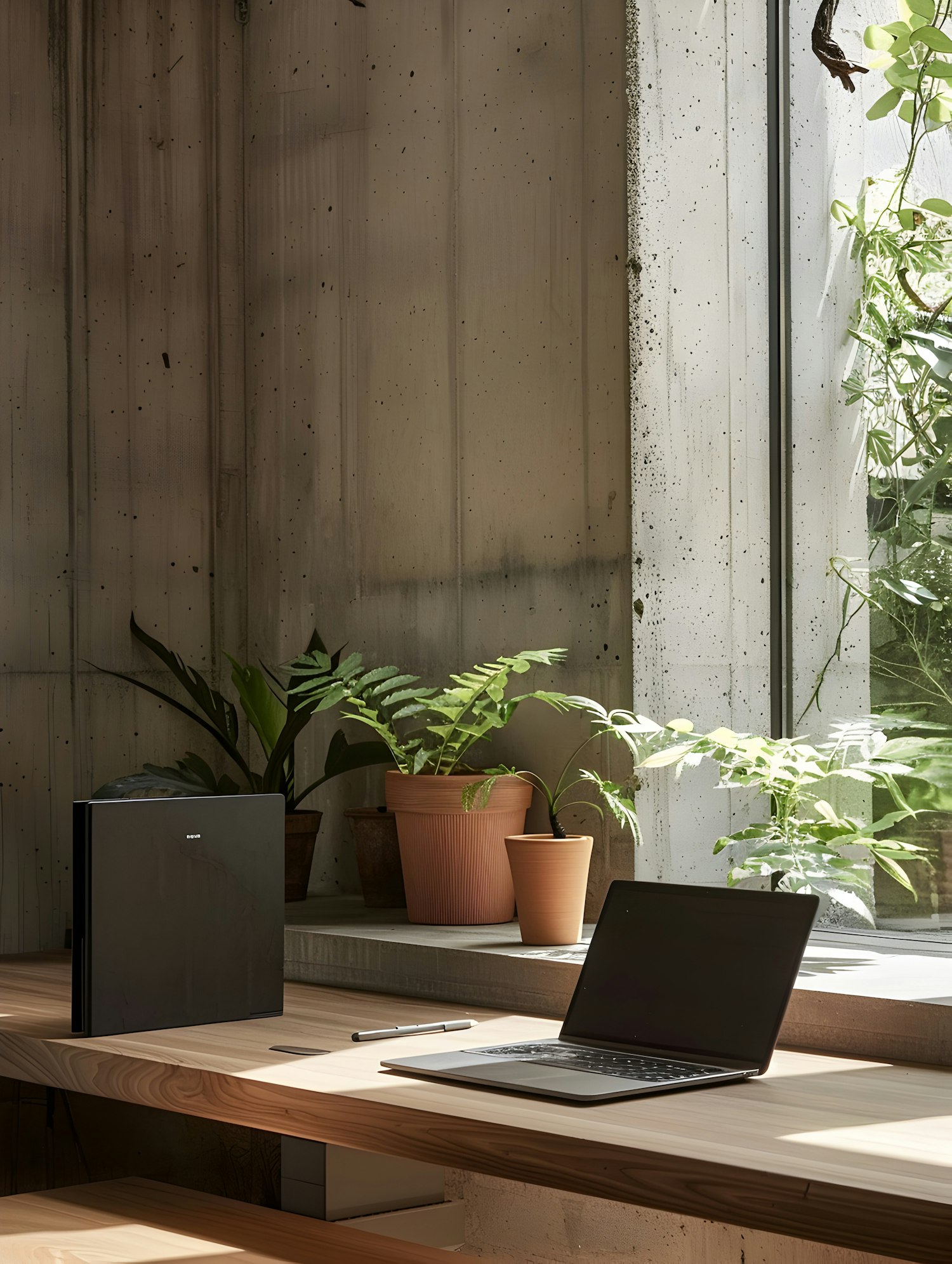 Modern workspace with a laptop, stylus, and plants by a sunlit window, blending industrial and natural elements for a serene atmosphere.