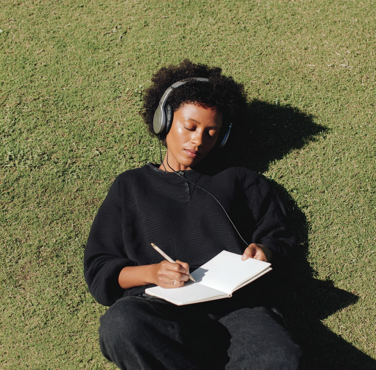 A person relaxes on a grassy field, wearing headphones and writing in a notebook, enjoying a peaceful moment outdoors.