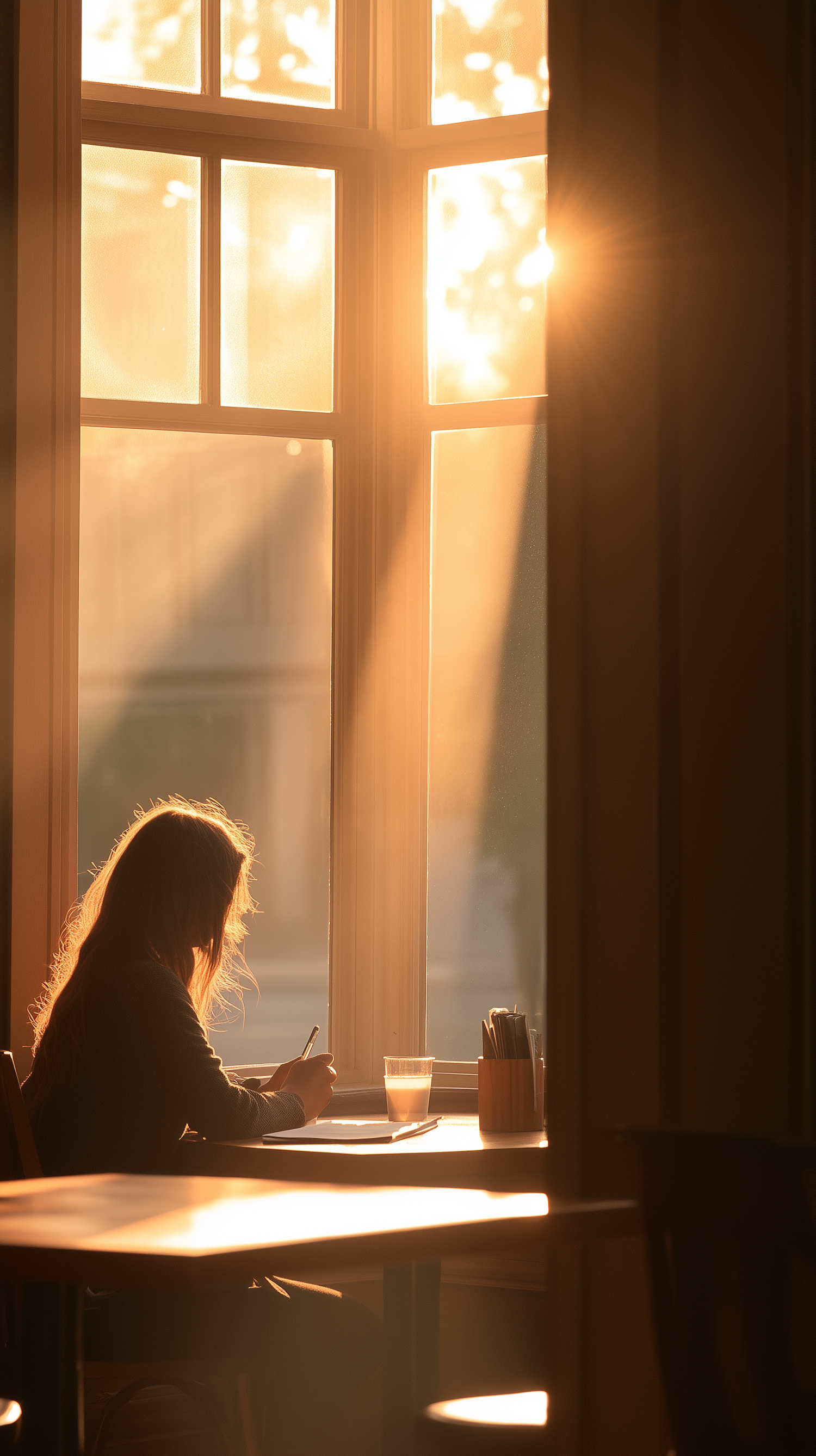 A young woman writing by a sunlit window, surrounded by warm golden light and a tranquil atmosphere.
