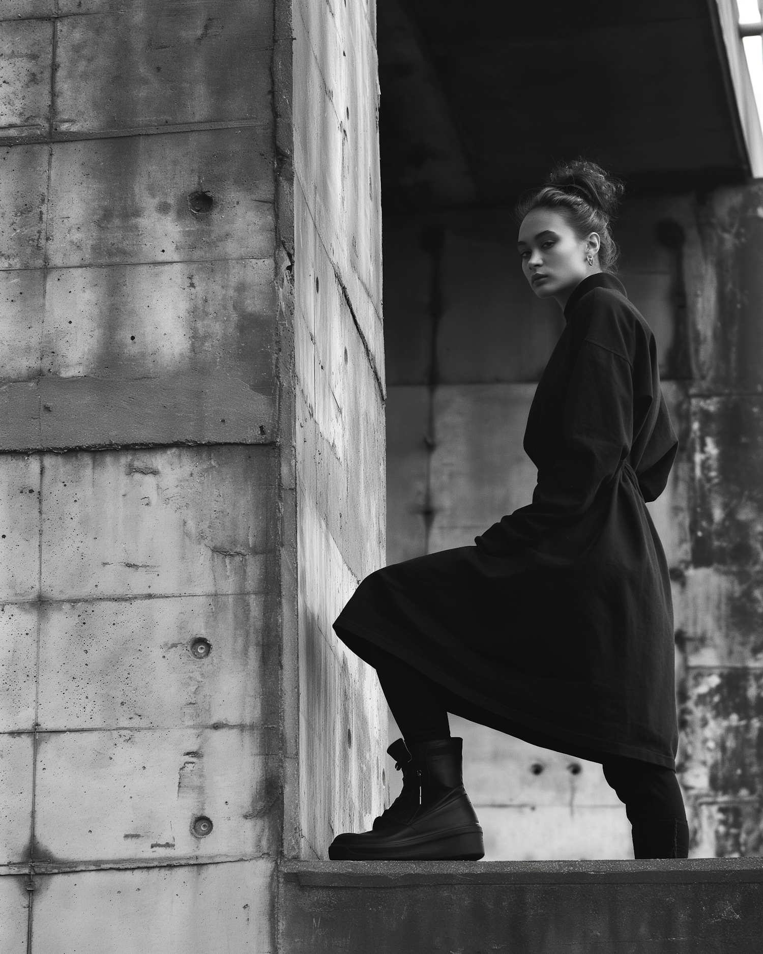 Black and white photo of a woman in a dark coat and boots against a concrete wall, exuding strength and introspection.