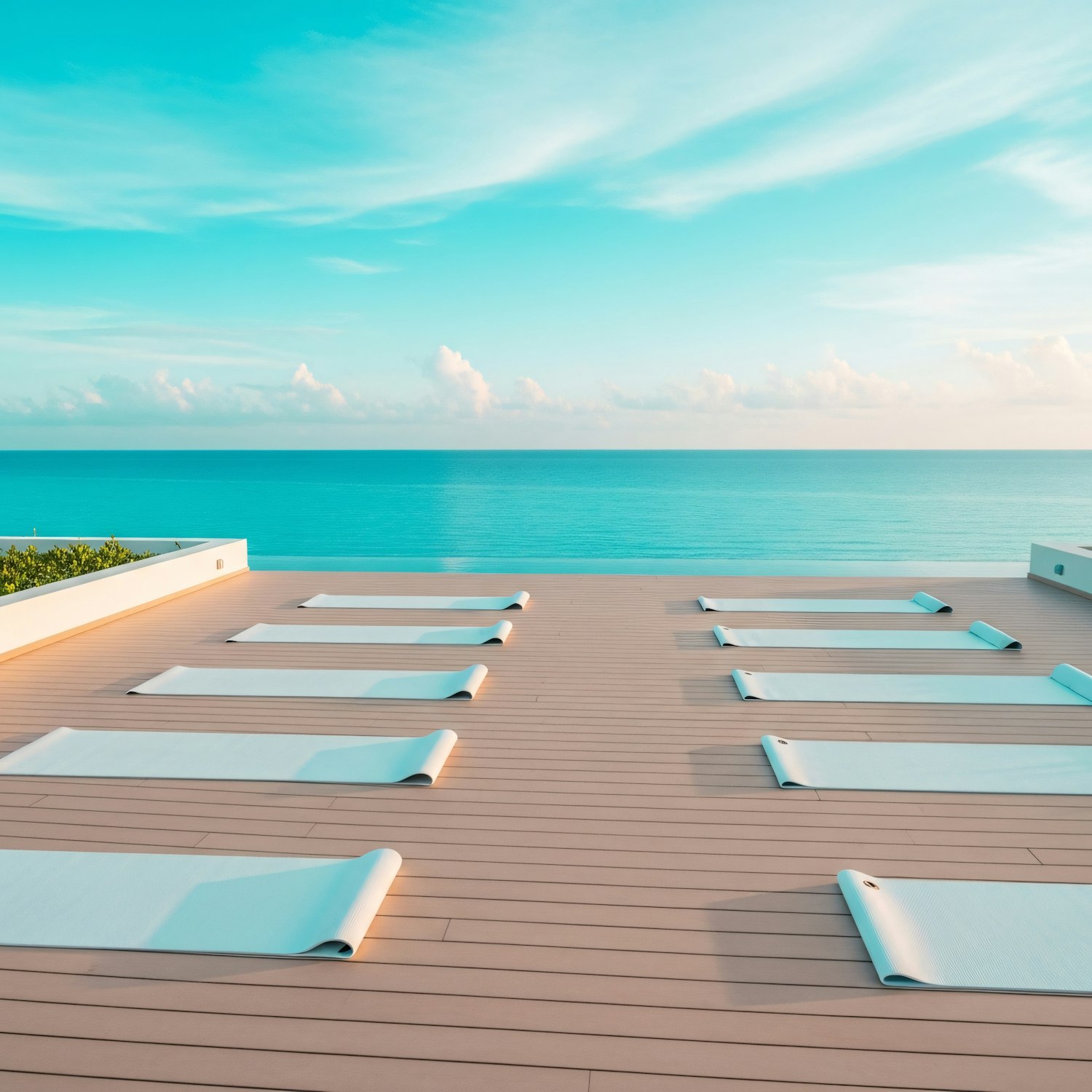 Peaceful yoga deck with mats overlooking a calm ocean and clear blue sky, perfect for relaxation and mindfulness.