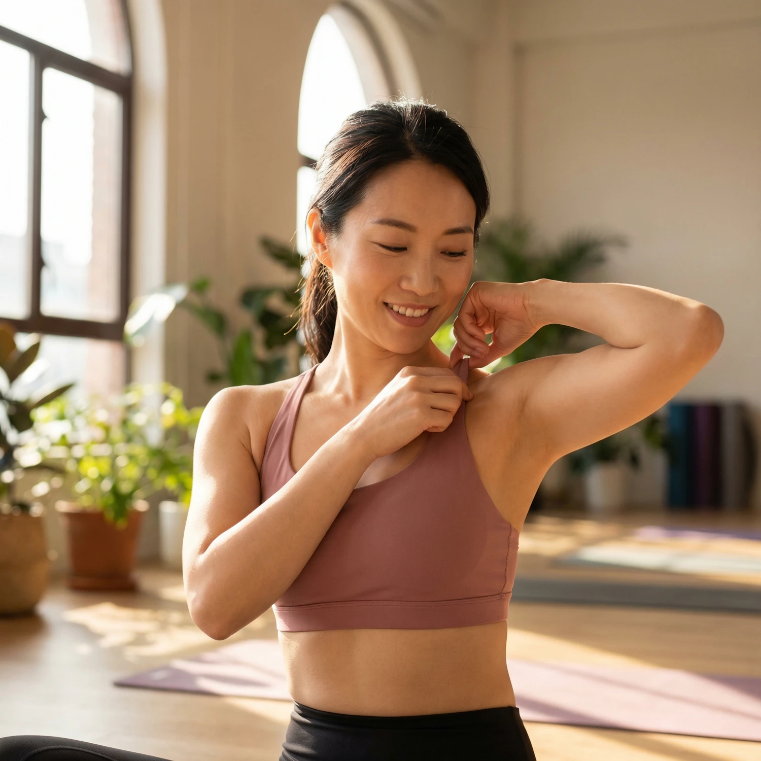 A woman in a sunlit room adjusts her sports bra strap, surrounded by yoga mats and plants, creating a serene and inviting atmosphere.