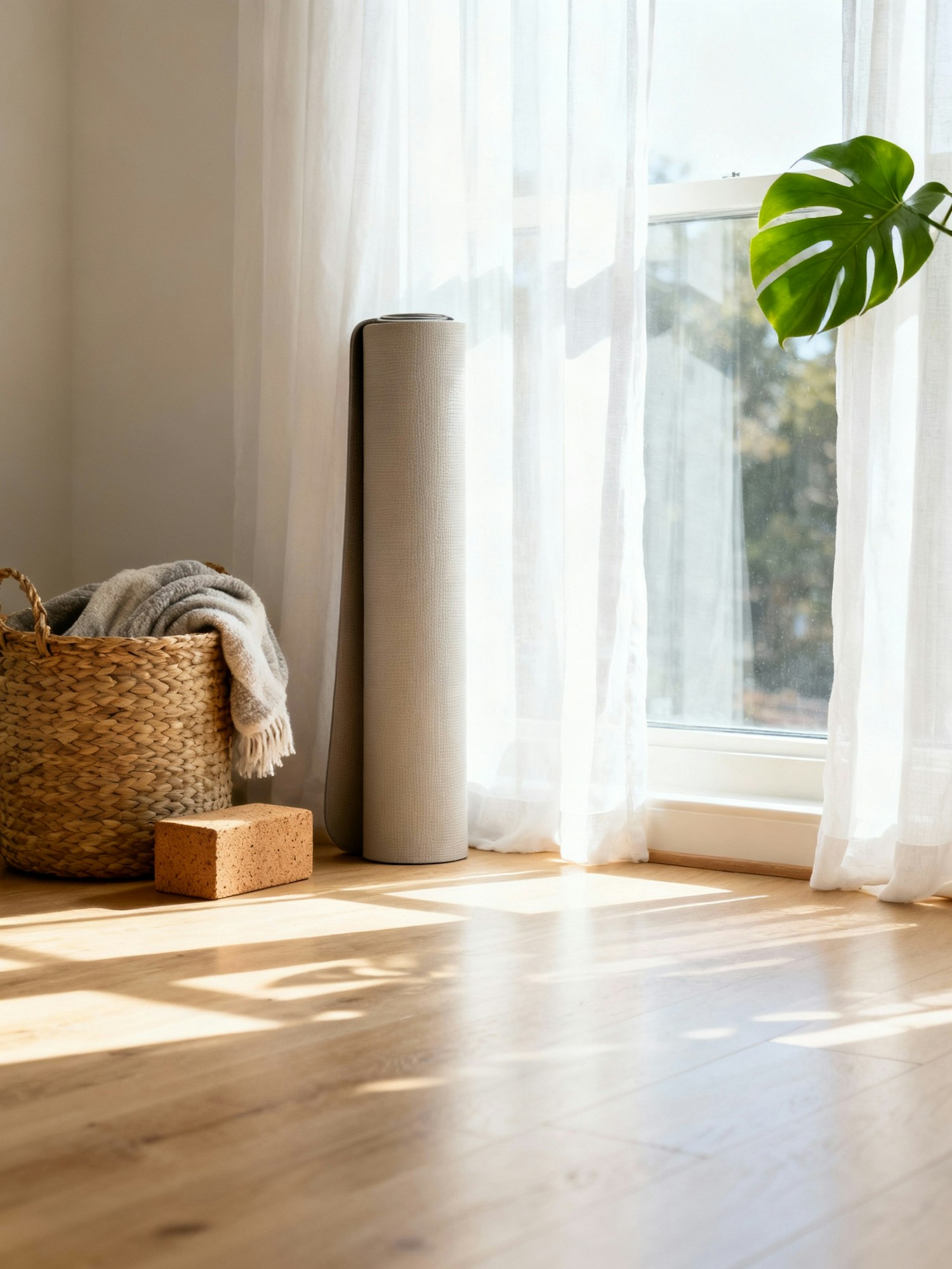 Yoga relaxation scene in front of a tall window with sheer white curtains, light wood floor, neutral mat rolled out toward the glass, beside it a woven basket with an extra blanket and cork yoga block, plant leaves touching the curtain edge, daylight pouring in and washing the floor with a bright, tranquil glow. 35 mm, f/4, ISO 100, 1/160 s; CPL lightly used to keep window reflections soft. Negative: clutter outside window, harsh speculars, HDR look.