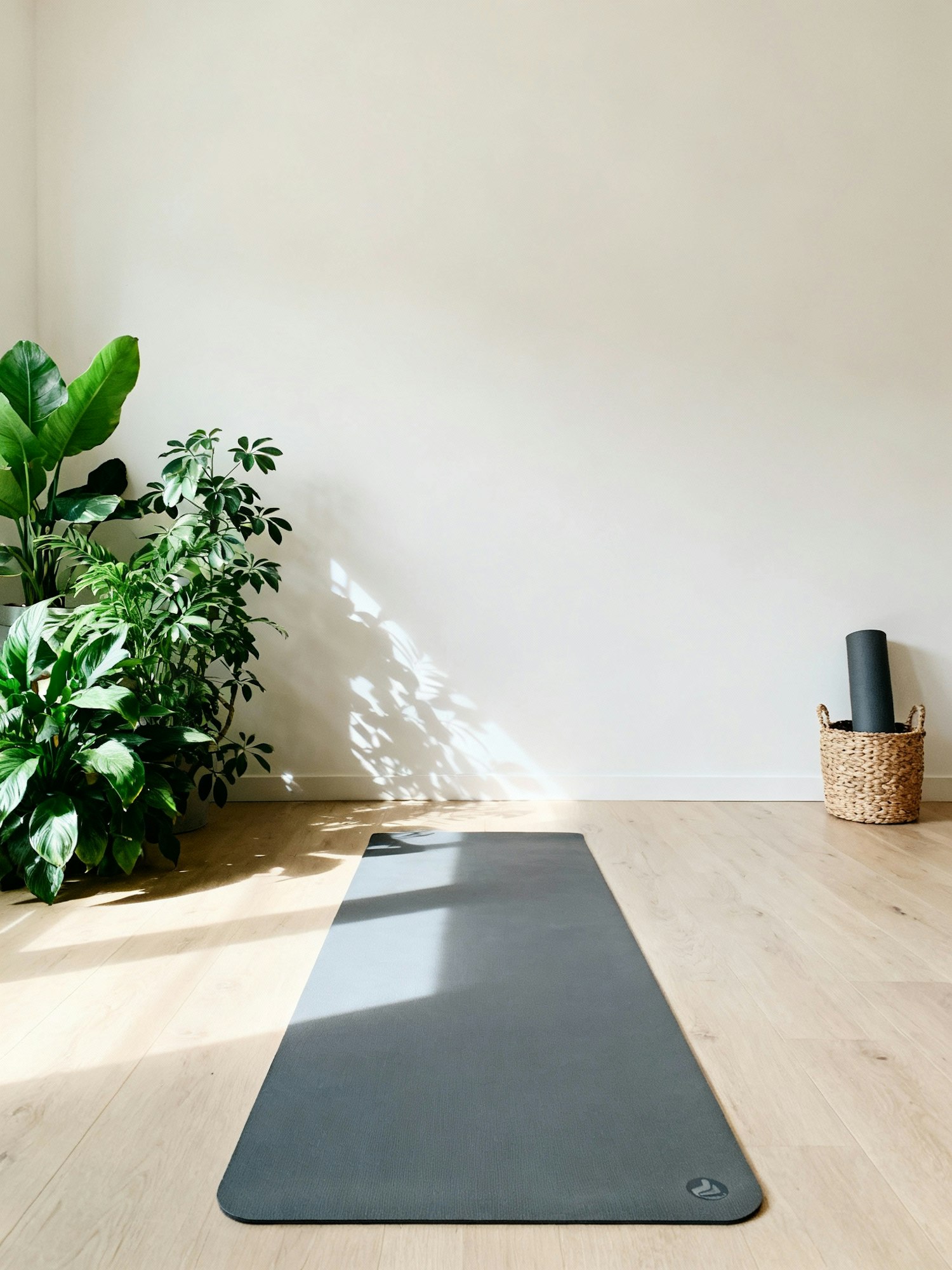 Light-filled room with large indoor plant cluster (two different heights) to the left, neutral yoga mat on light wood floor centered in front of an off-white wall, small woven basket to the right holding an extra rolled mat; daylight from camera-left gives a fresh, wellness feel, shadows from the leaves stay very soft. 35 mm, f/4, ISO 100, 1/160 s; daylight WB. Negative: strong leaf shadows, bright patterned pots, reflective floors, visible text on items.