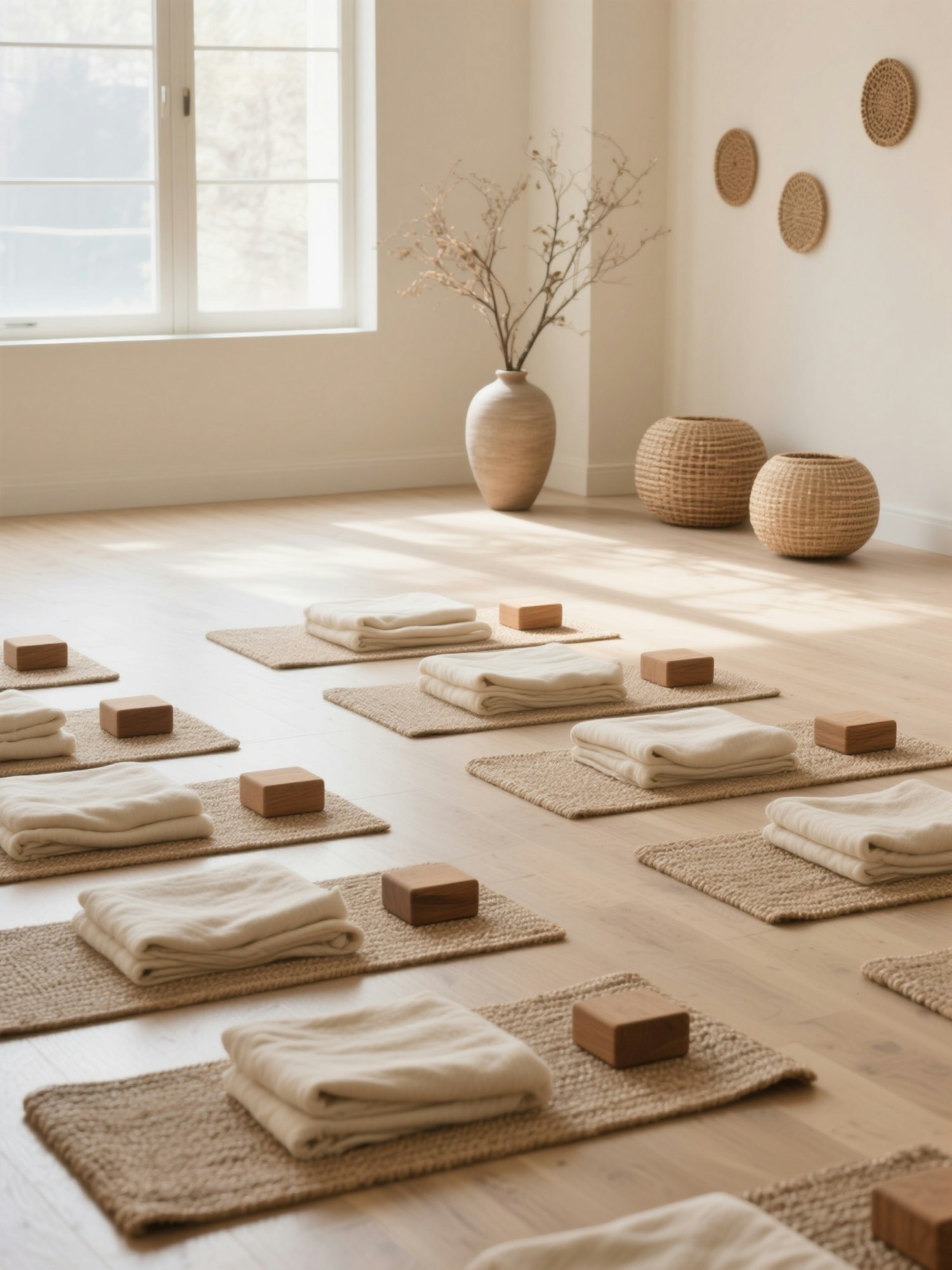 Minimalist, aesthetic editorial photography, soft neutral tones such as cream, beige, taupe, and warm browns, clean uncluttered background, gentle diffused natural light with soft shadows, smooth even contrast, realistic skin and fabric textures, high resolution, crisp focus, luxury lifestyle yoga campaign look — serene yoga studio with natural light from a large window, soft cream walls, light wooden floor with beige woven mats, each mat set with a folded cream blanket and a wooden yoga block, minimal decor including a vase with dried branches and round woven ornaments
