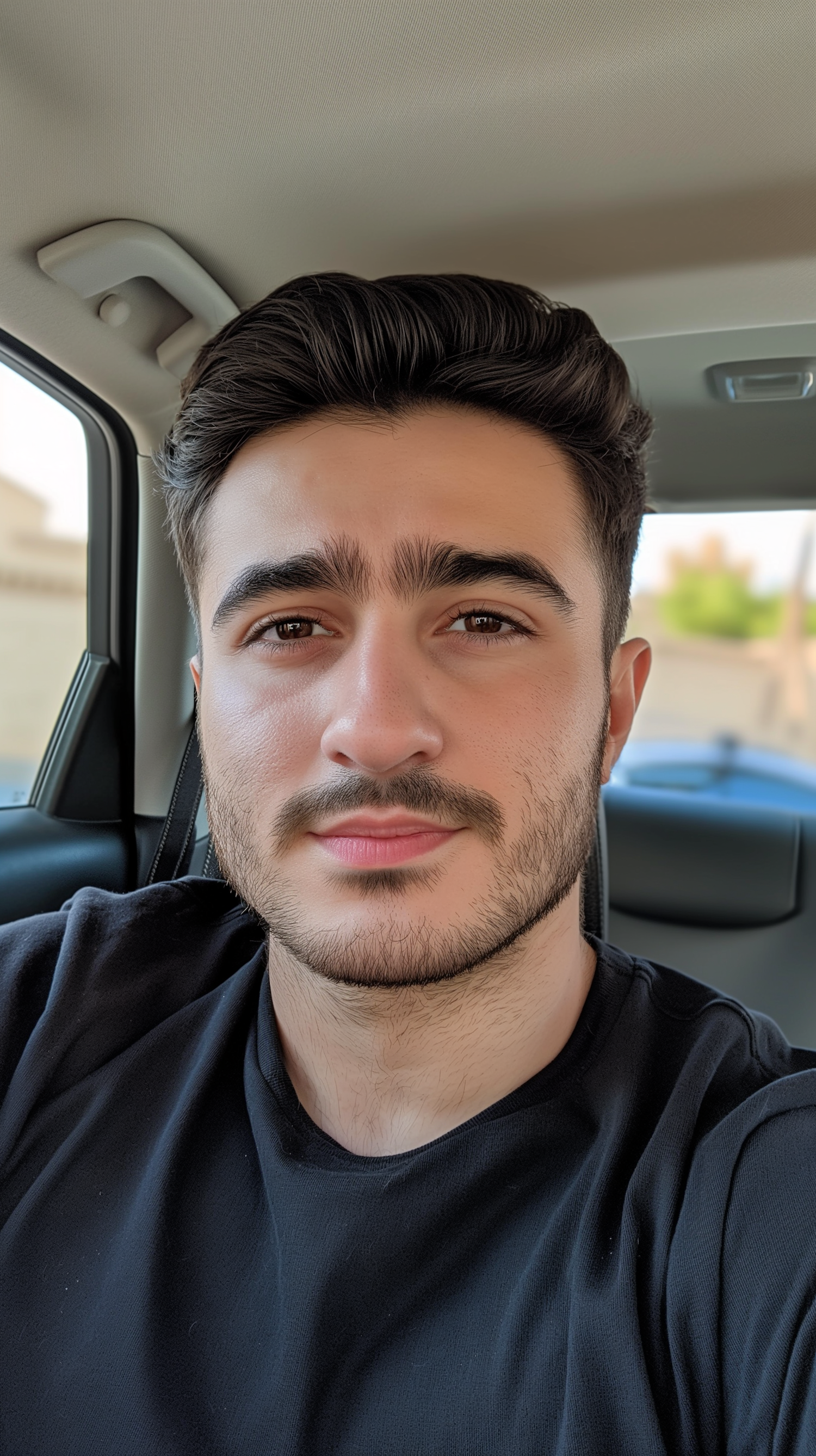 Young man with dark hair and beard in a car, wearing a black t-shirt, looking at the camera with a neutral expression.